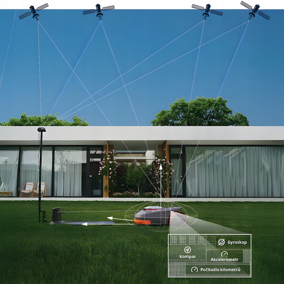 Wirtualne granice w aplikacji zastępują przewody. Jeśli zmienisz układ ogrodu (basen, trampolina), jednym kliknięciem aktualizujesz strefę koszenia.
