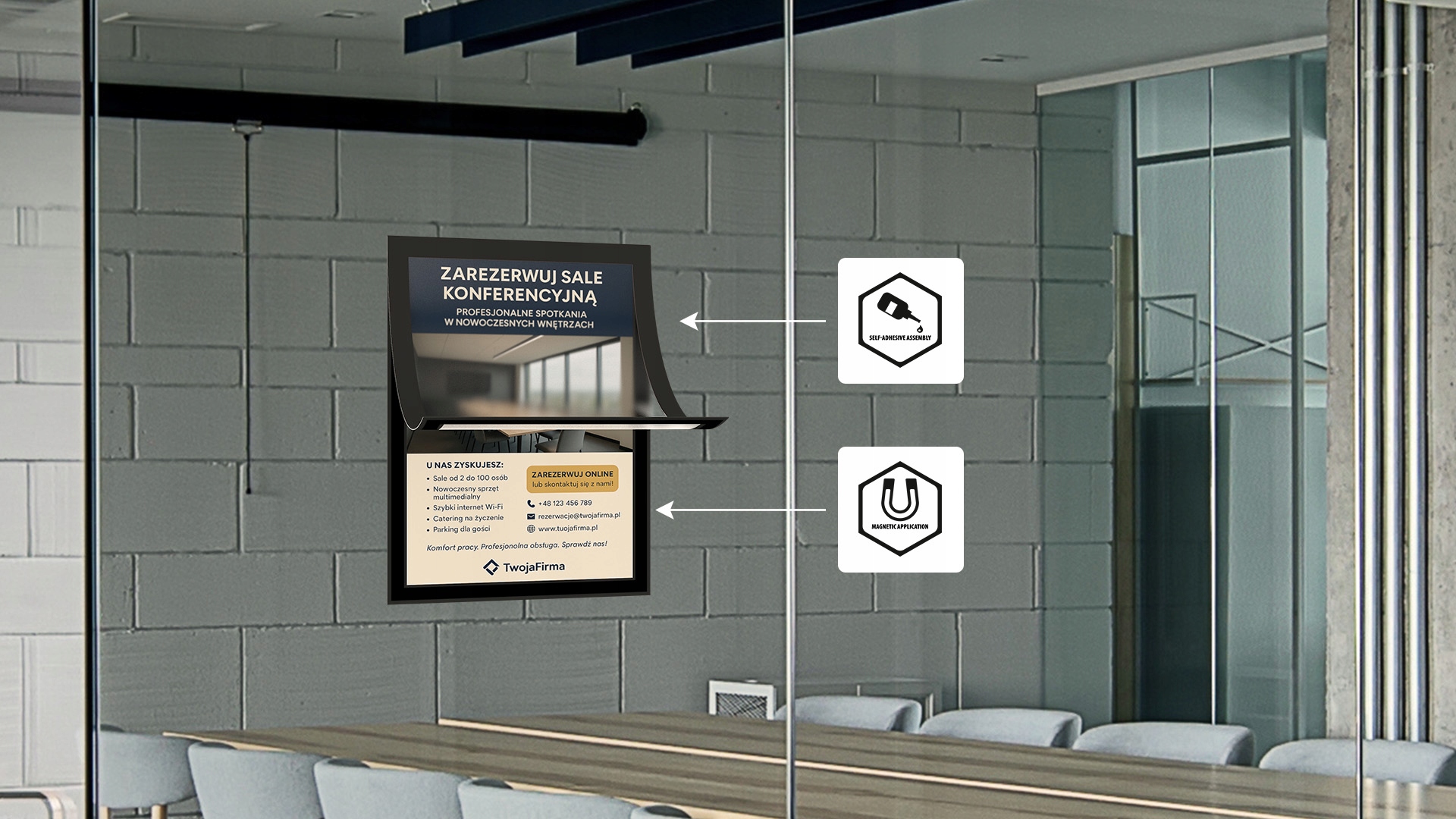 Dzięki specjalnej konstrukcji, wymiana arkuszy, wydruków czy innych włożonych do koszulki materiałów, jest szybka i wygodna – wystarczy odchylić boki ramki, bez konieczności odklejania jej od podłoża.