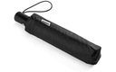 Черный складной зонт с 8 панелями, на одной панели aquaprint Škoda (виден после намокания материала), на следующей панели electric green напечатан Škoda длиной 14 см.