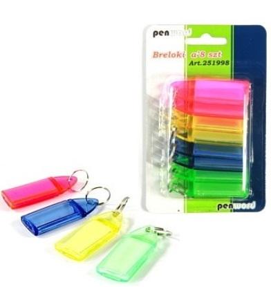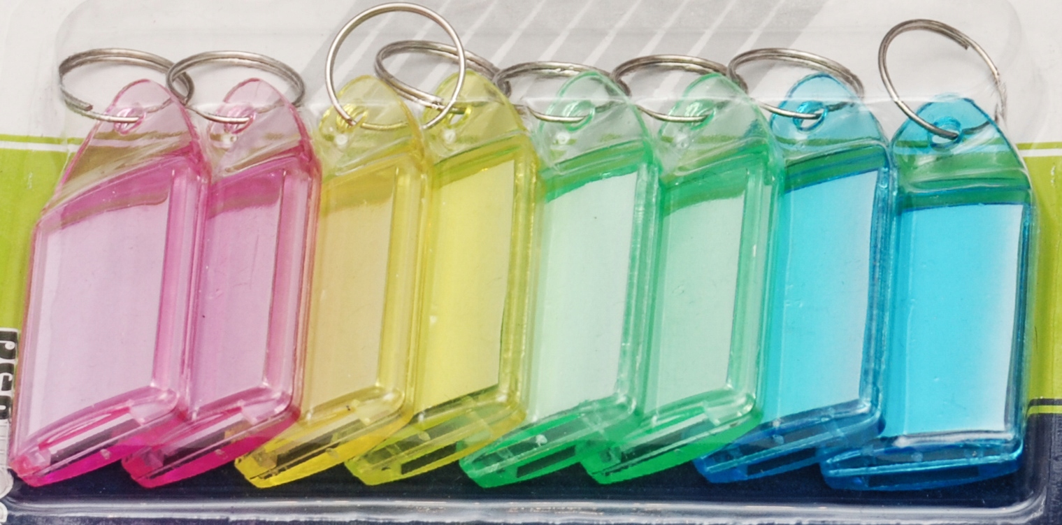 Różnokolorowe, plastikowe zawieszki do kluczy.