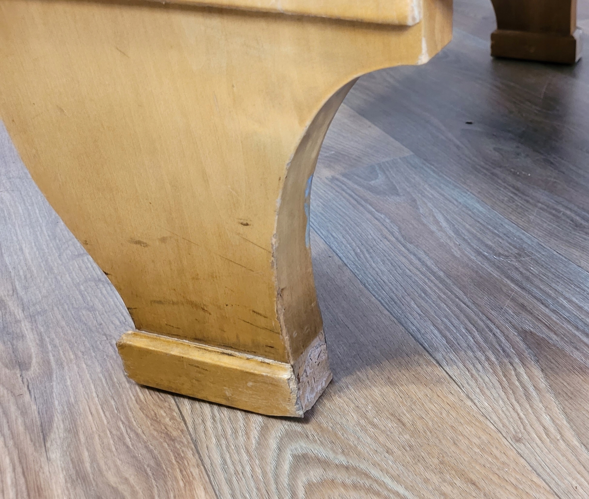 Zachowany w dobrym stanie - widoczne niedoskonałości - drobny ubytek forniru, brak listewek po wewnętrznej stronie nóżek oraz drobne przetarcia na bokach.