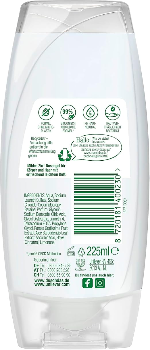 Formuła Duschdas Men Sensitive 2 w 1 została wzbogacona o aloe vera i witaminę E, które nawilżają skórę oraz pomagają jej odzyskać naturalną równowagę. Dzięki delikatnym składnikom, produkt zapewnia uczucie świeżości przez cały dzień, a skóra i włosy pozostają gładkie i zadbane.