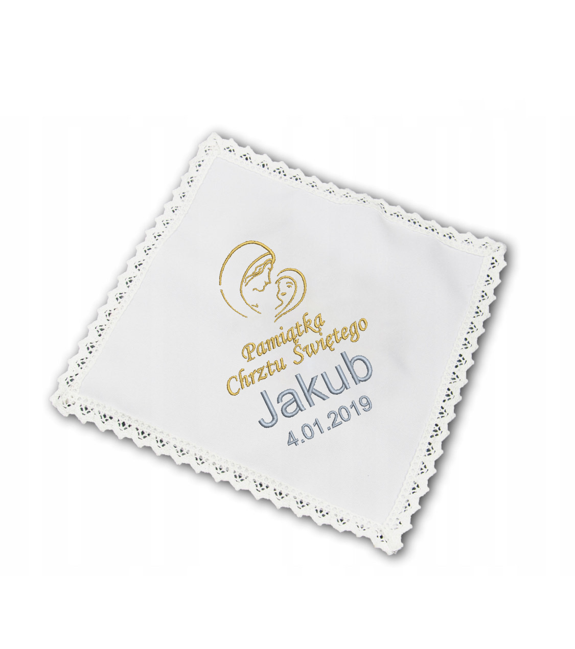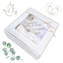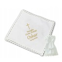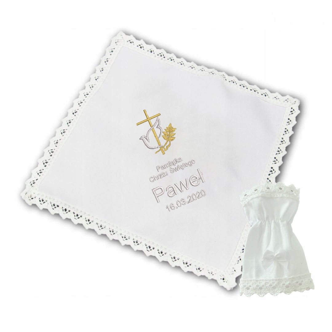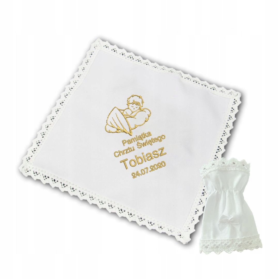 Szatka do Chrztu Świętego z haftem w pełni spersonalizowanym w ozdobnym kartoniku, gotowa do wręczenia na prezent