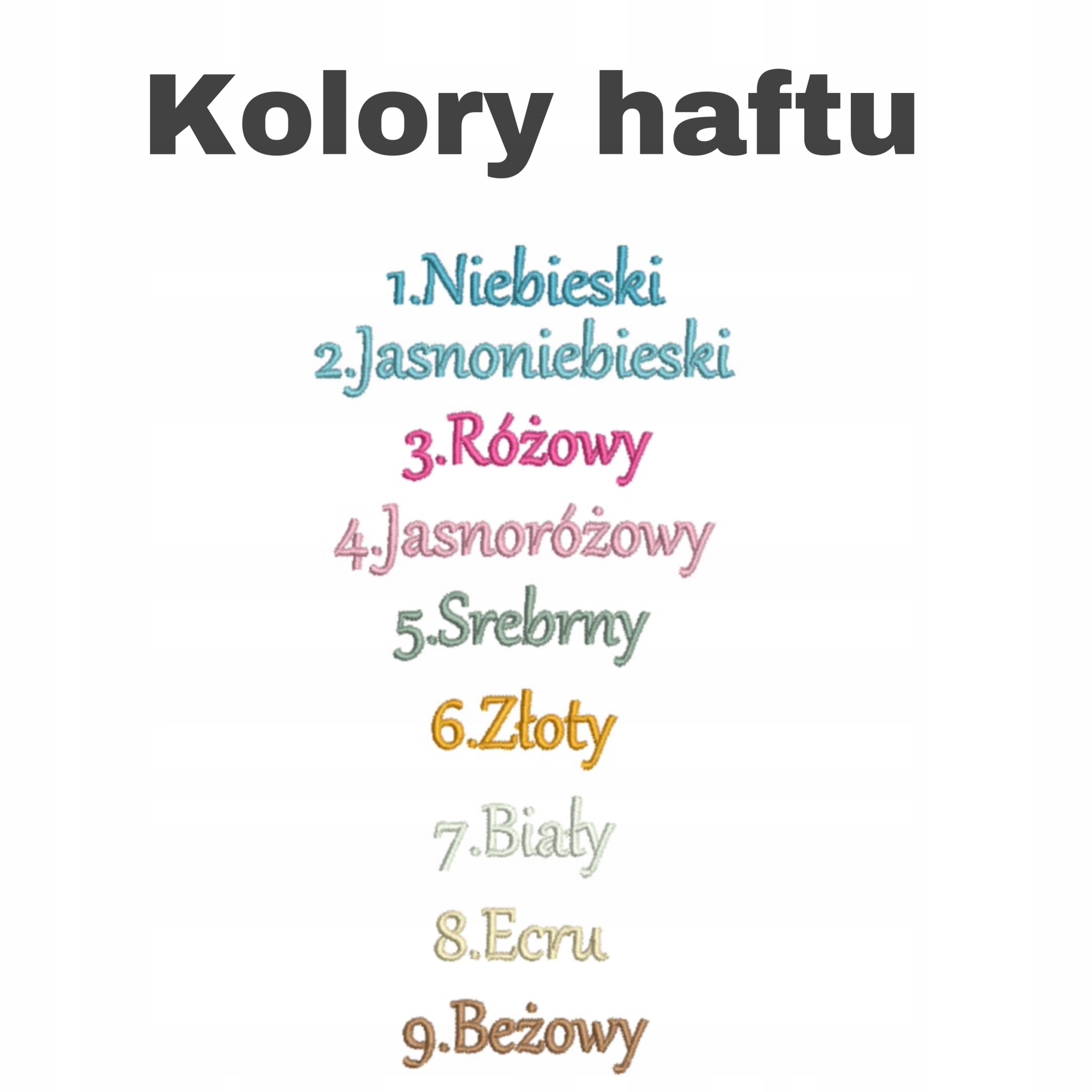 4. Wybierz KOLOR HAFTU (dysponujemy pełną kolorystyką nici do haftu), ale na szatce proponujemy poniższe kolory. Każdy element haftu może być w innym kolorze.