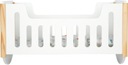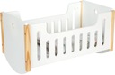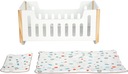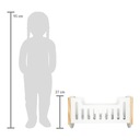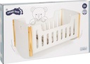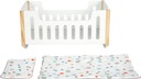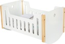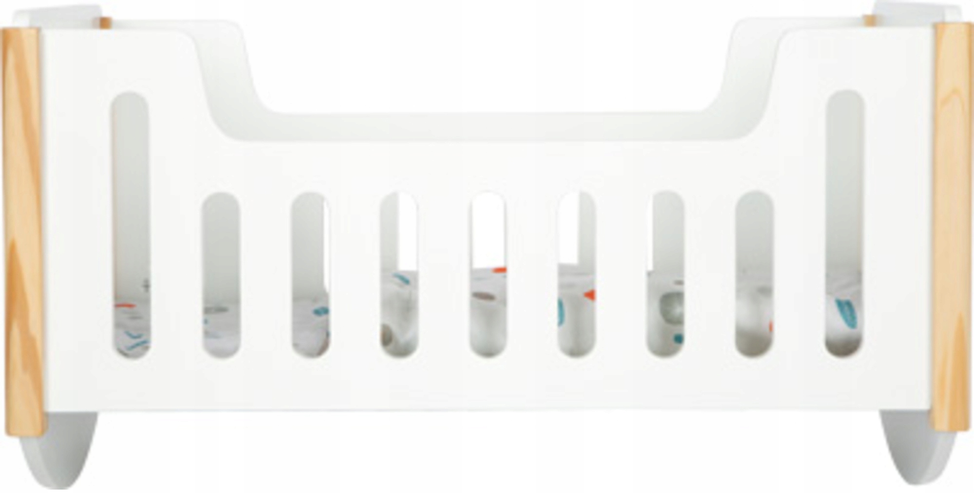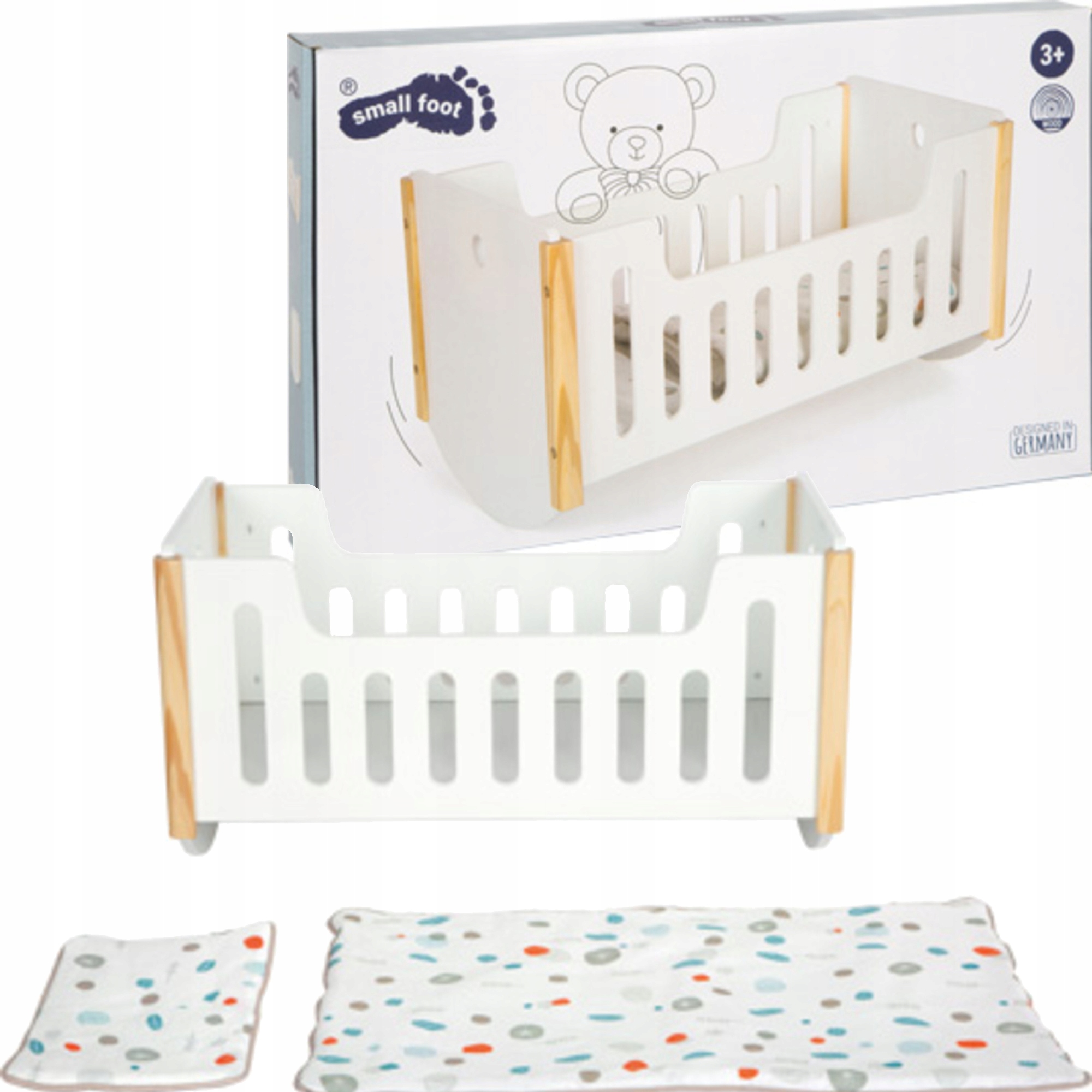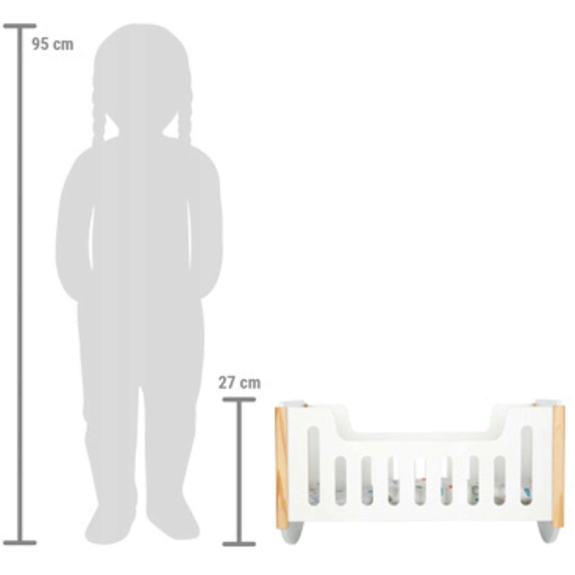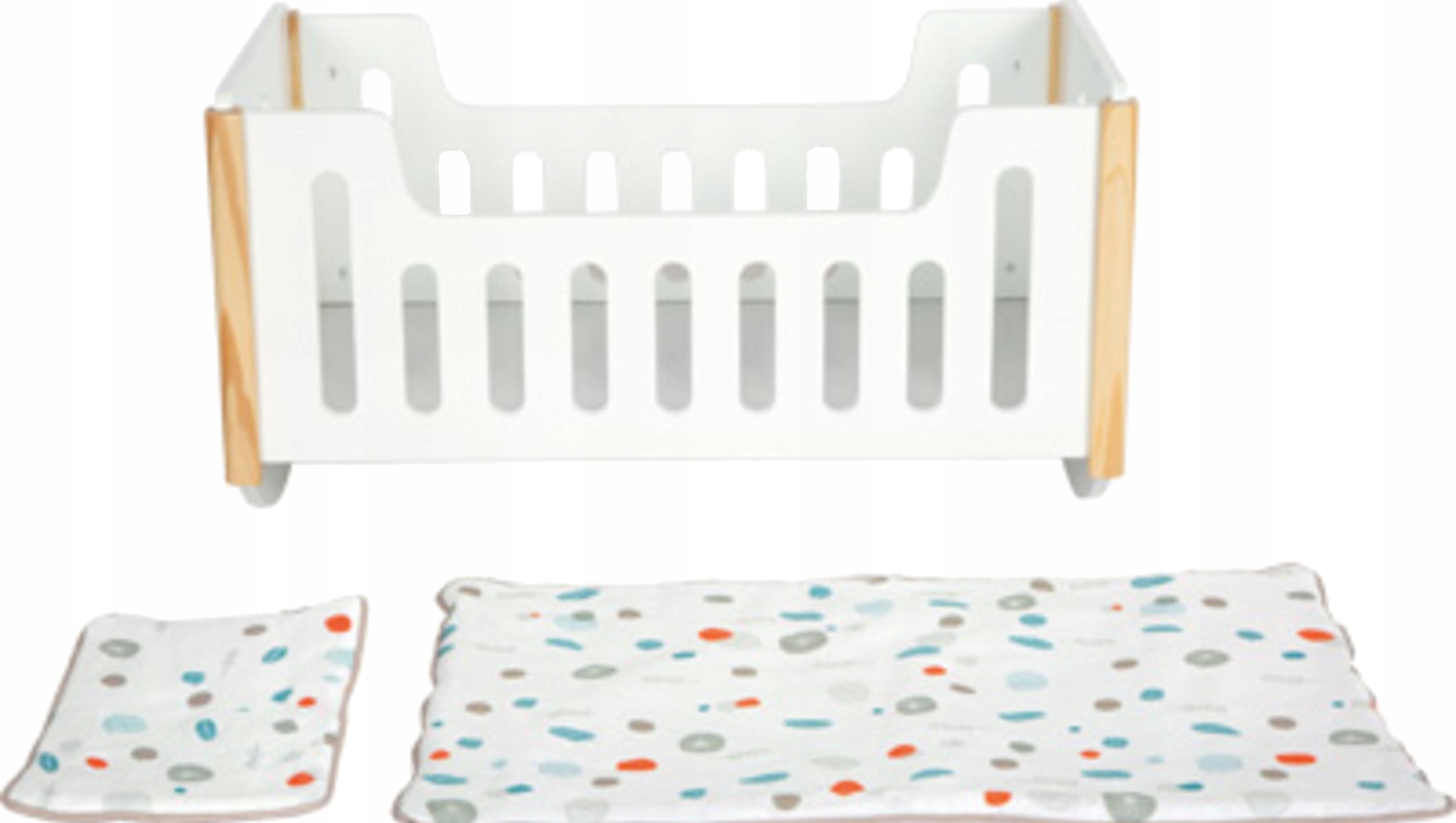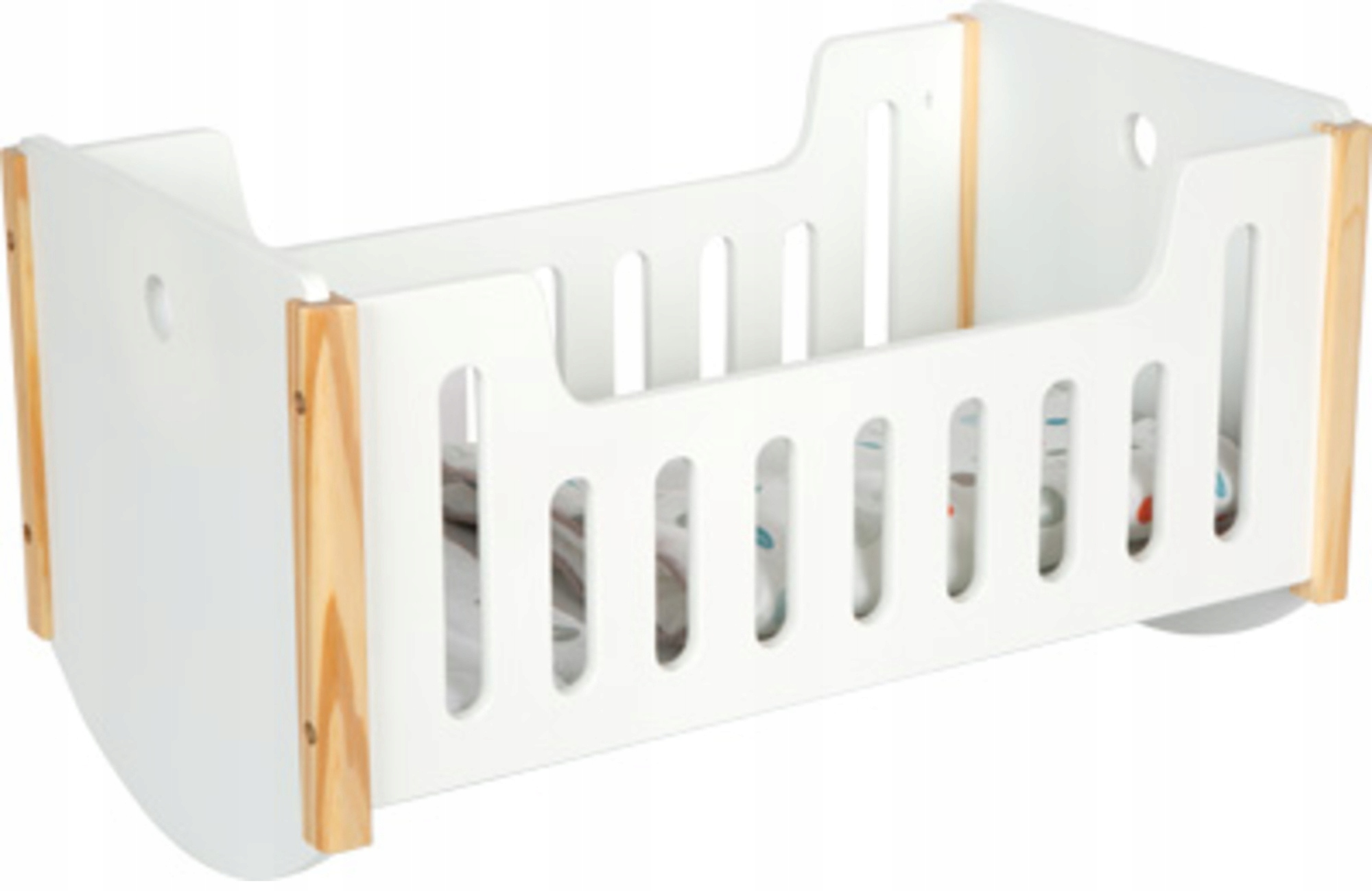 Urocze łóżeczko wykonane ze stabilnego drewna w białej kolorystyce ozdobionej ślicznymi grafikami, pozwoli dziewczynkom delikatnie kołysać do snu swoje lalki i pluszaki do 46 cm wysokości. Wyłożone jest białym kocykiem z kolorowym wzorkiem i posiada małą miękką poduszkę.