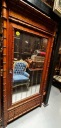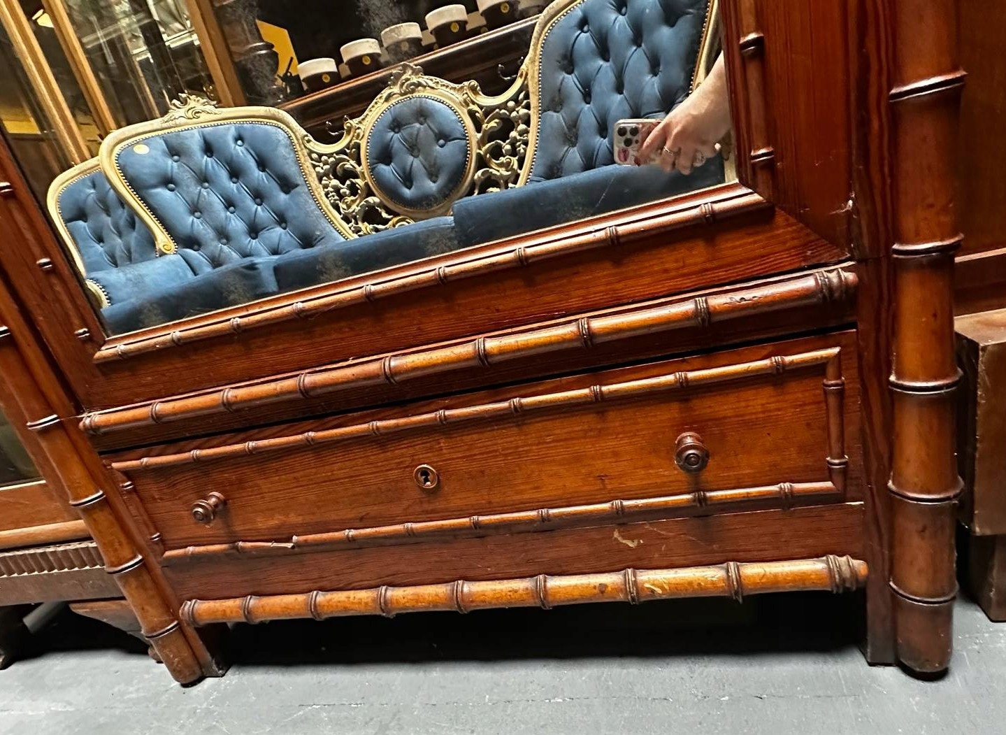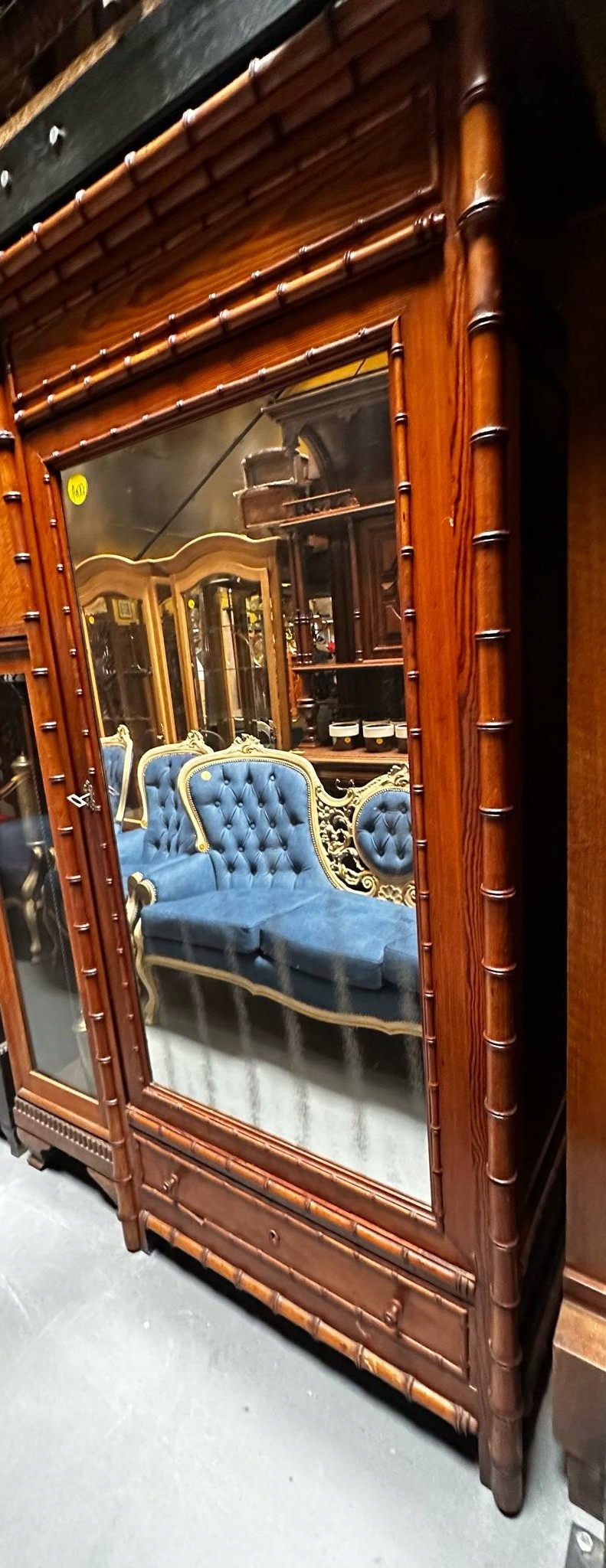 Szafa w stylu bambusowym, wykonana z litego drewna, najprawdopodobniej dębu lub sosny. Front zdobi duże lustro oraz charakterystyczne aplikacje przypominające bambusowe wykończenie, co nadaje meblowi unikalny charakter i elegancję.