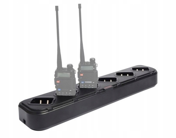 Stacja ładująca przeznaczona do radiotelefonu ręcznego Baofeng UV-5R i UV-5R HT. Stacja umożliwia ładowanie 6 sztuk radiotelefonów naraz. Ładowarka umożliwia ładowanie radiotelefonów z zamontowaną baterią lub samych akumulatorów.
