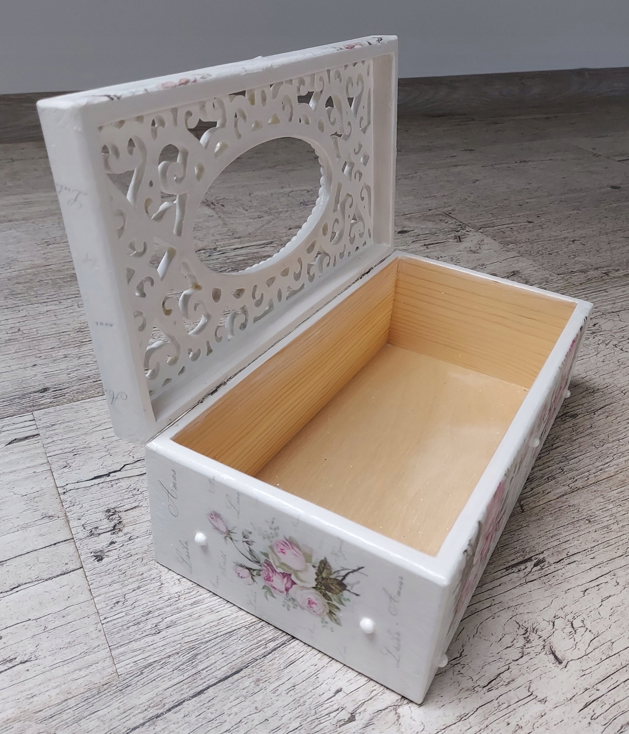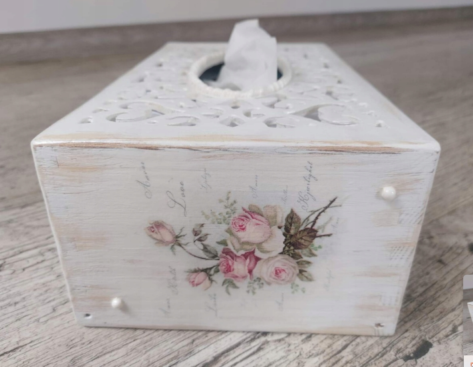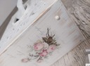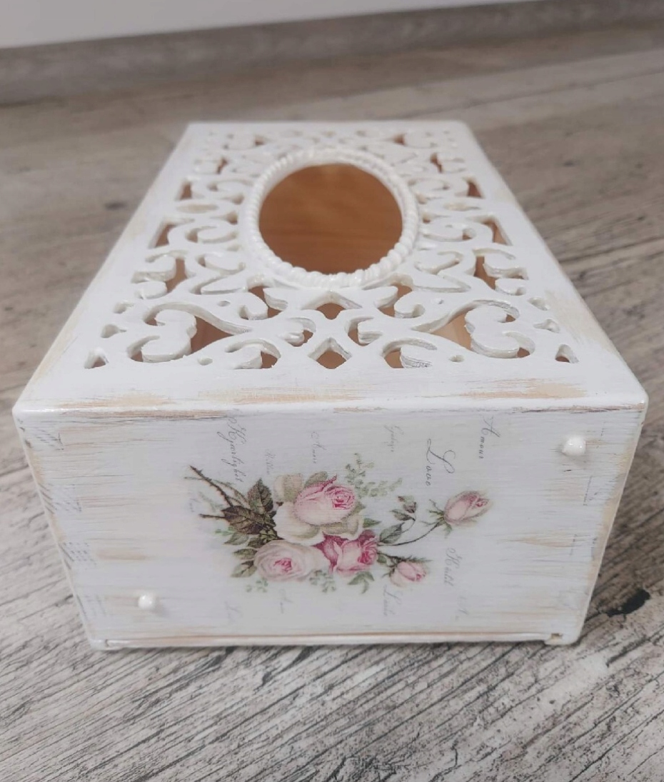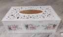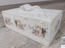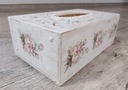 Drewniane pudełko na chusteczki pomalowane jest z zewnątrz farbą kredową/akrylową. Pudełko ozdobione techniką decoupage w stylu shabby chic. Dodane przetarcia charakterystyczne dla stylu shabby chic (możemy wykonać pudełko jednolitym tłem, bez przetarć). Całość zabezpieczona bezbarwnym lakierem akrylowym.