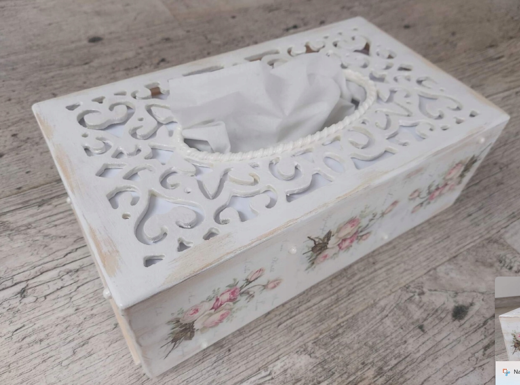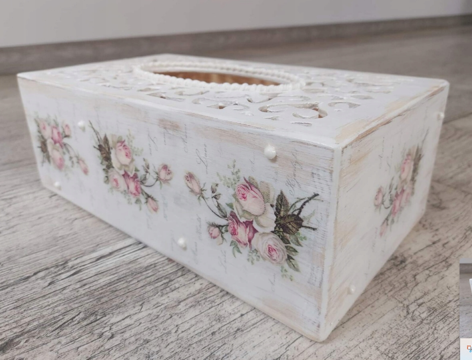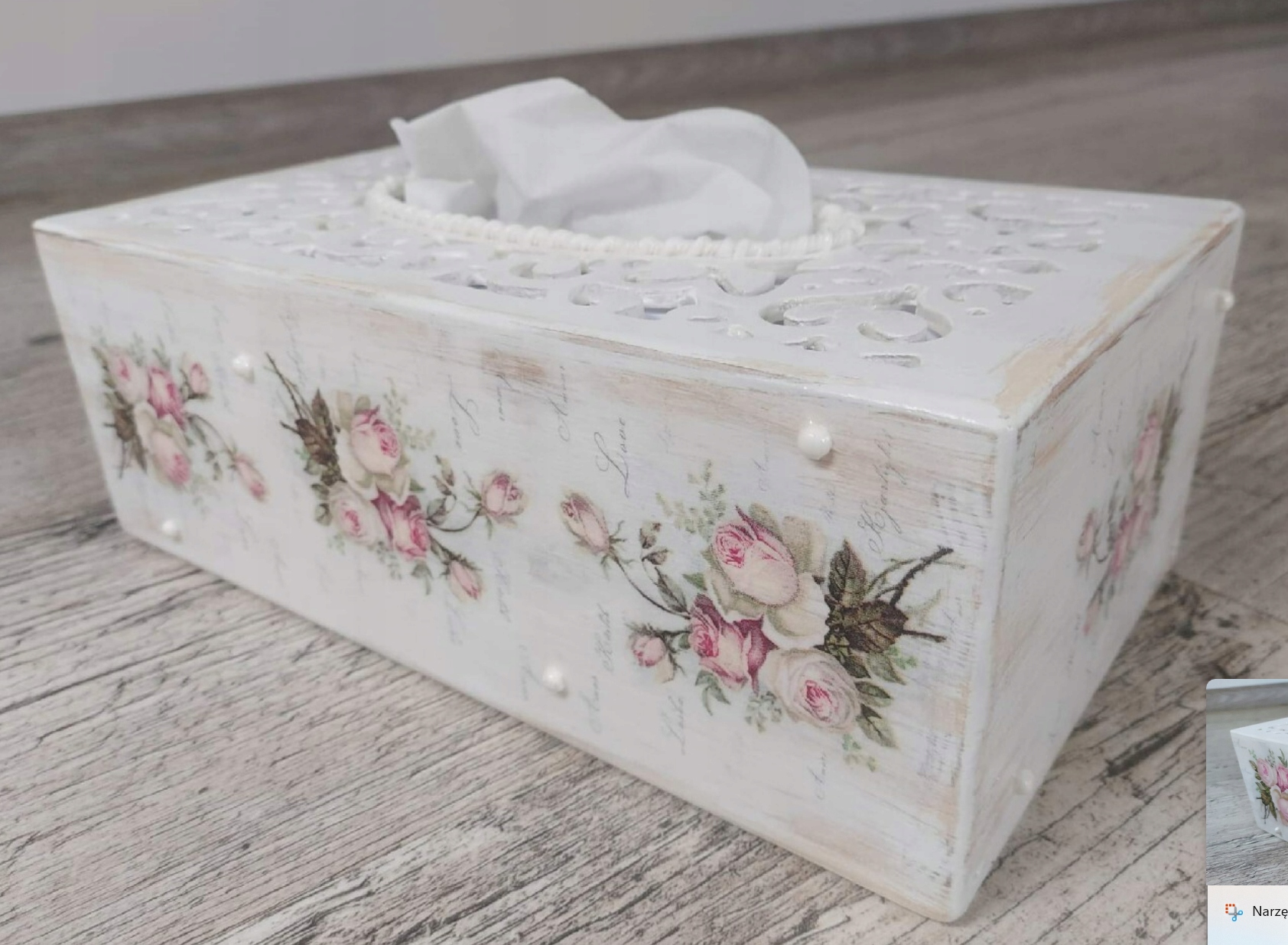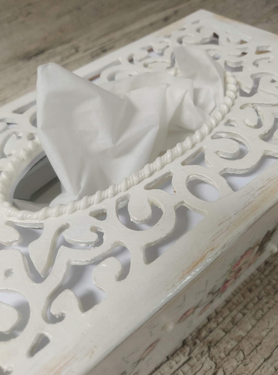 Przedmiotem sprzedaży jest ręcznie zdobione ażurowe pudełko na chusteczki (chustecznik). Idealne na wyjątkowy i niepowtarzalny prezent.