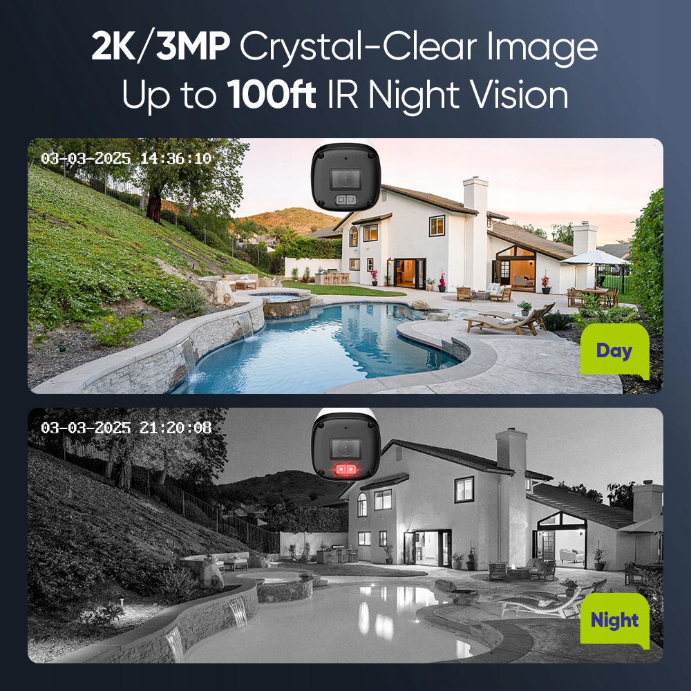 Doświadcz krystalicznie czystego obrazu dzięki naszej kamerze wysokiej rozdzielczości 2K/3MP, szczycącej się rozdzielczością 2304×1296. Oferuje 1.5 razy większą klarowność niż 1080P i trzykrotnie zwiększa ostrość 720P. Wyposażony w przetwornik 1/2.7" Progressive Scan C,MOS, zapewnia wyraźny obraz zarówno w dzień, jak i w nocy.