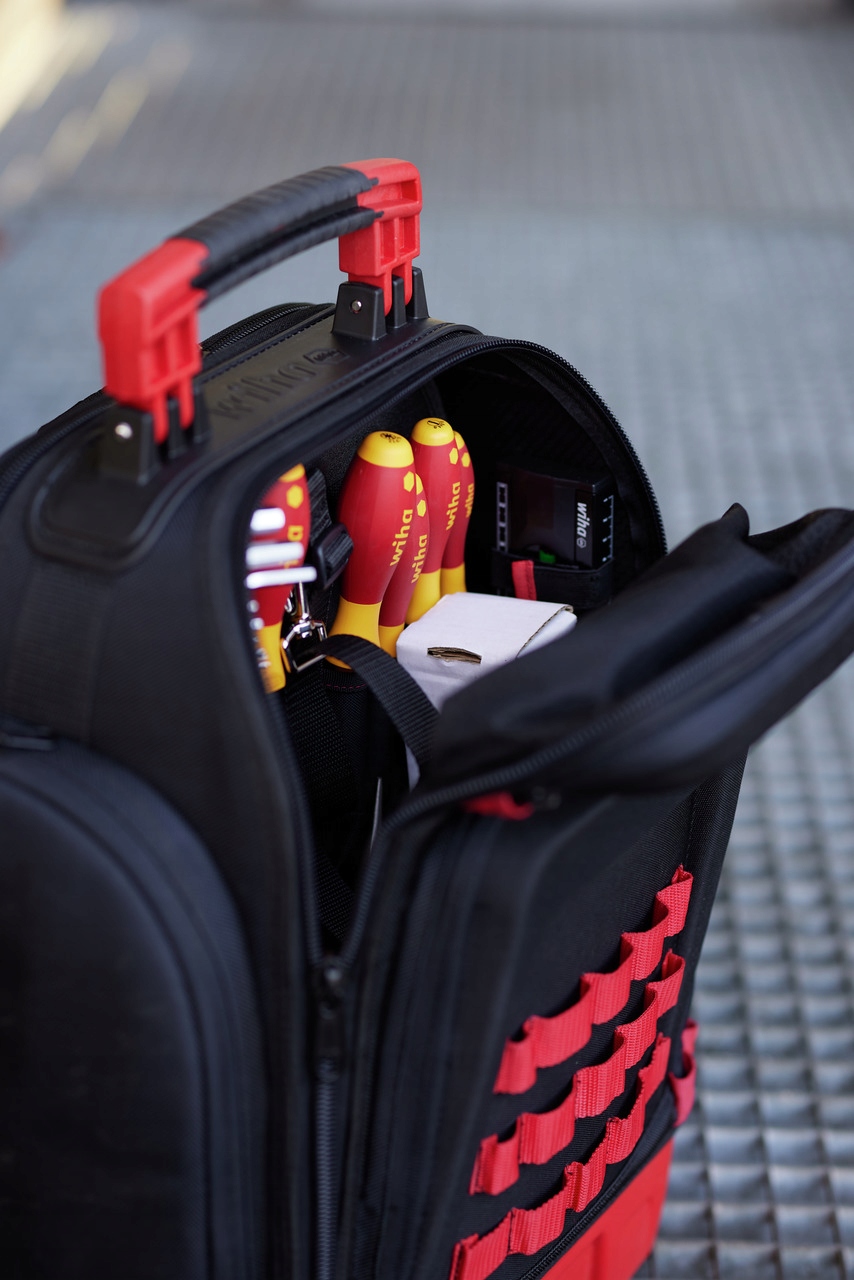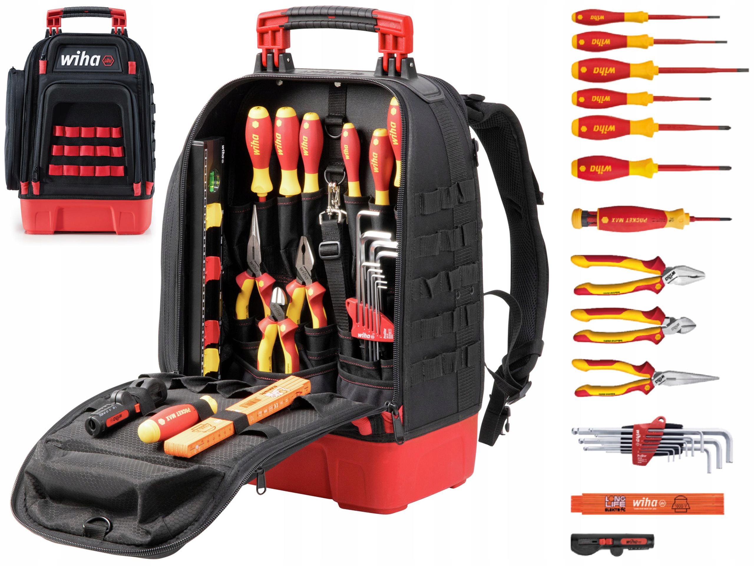 Кому нужны руки, нужны две свободные руки. Рюкзак для инструментов Wiha для электриков это идеальное решение, и его запатентованный дизайн обеспечивает неограниченную свободу. Усовершенствованная система отсеков обеспечивает четкую организацию и легкое удаление инструментов. Для быстрого доступа к инструментам достаточно открыть только 1/3 крышки рюкзака. Всего 77 места для хранения и 30 гибких вариантов крепления позволяют настроить рюкзак в соответствии с вашими и оснастить его дополнительными инструментами и аксессуарами. Прочное дно рюкзака с устойчивым основанием при открытии рюкзак не опрокидывается. Кроме того, прочный материал, из которого изготовлено дно рюкзак, хорошо работает во влажных и грязных условиях работы. Рюкзак для инструментов - это не только мастерская для работы на ходу, а также мобильный офис. Отделение для ноутбука и документов позволяет безопасное и чистое хранение, эффективно отделяя его от инструментов. Удобное ношение они обеспечивают регулируемые и дышащие опорные элементы и прочную нескользящую ручку. Рюкзак соответствует самым высоким стандартам качества благодаря изготовлению верхнего слоя из материала 1680D и использование застежек-молний YKK. Он также имеет отдельные мягкие отсеки для ценных и предметы. В комплект поставки рюкзака входит набор из 10 гаечных ключей, а также шестьэргономичные отвертки и компактный pocketmax®, безопасность которых в эксплуатации подтверждается сертификат VDE. Кроме того, безопасная работа гарантируется изолированными универсальными плоскогубцами, плоскогубцами полукруглые и боковые режущие плоскогубцы. С их помощью можно легко удерживать, прикладывать или отрезать заготовку. Мобильный комплект для электриков дополняют спиртовой уровень Wiha, пример складной и мультитул для зачистки проводов. И, наконец, рюкзак можно настроить по индивидуальному заказу благодаря универсальной системе Molle. В интернете можно найти множество аксессуаров, крепится к практичным петлям и позволяет пополнять и расширять рюкзак (не относится к набора). С профессиональным рюкзаком для инструментов и набором высококачественных инструментов Wiha у вас есть все под рукой в любое время и в любом месте!