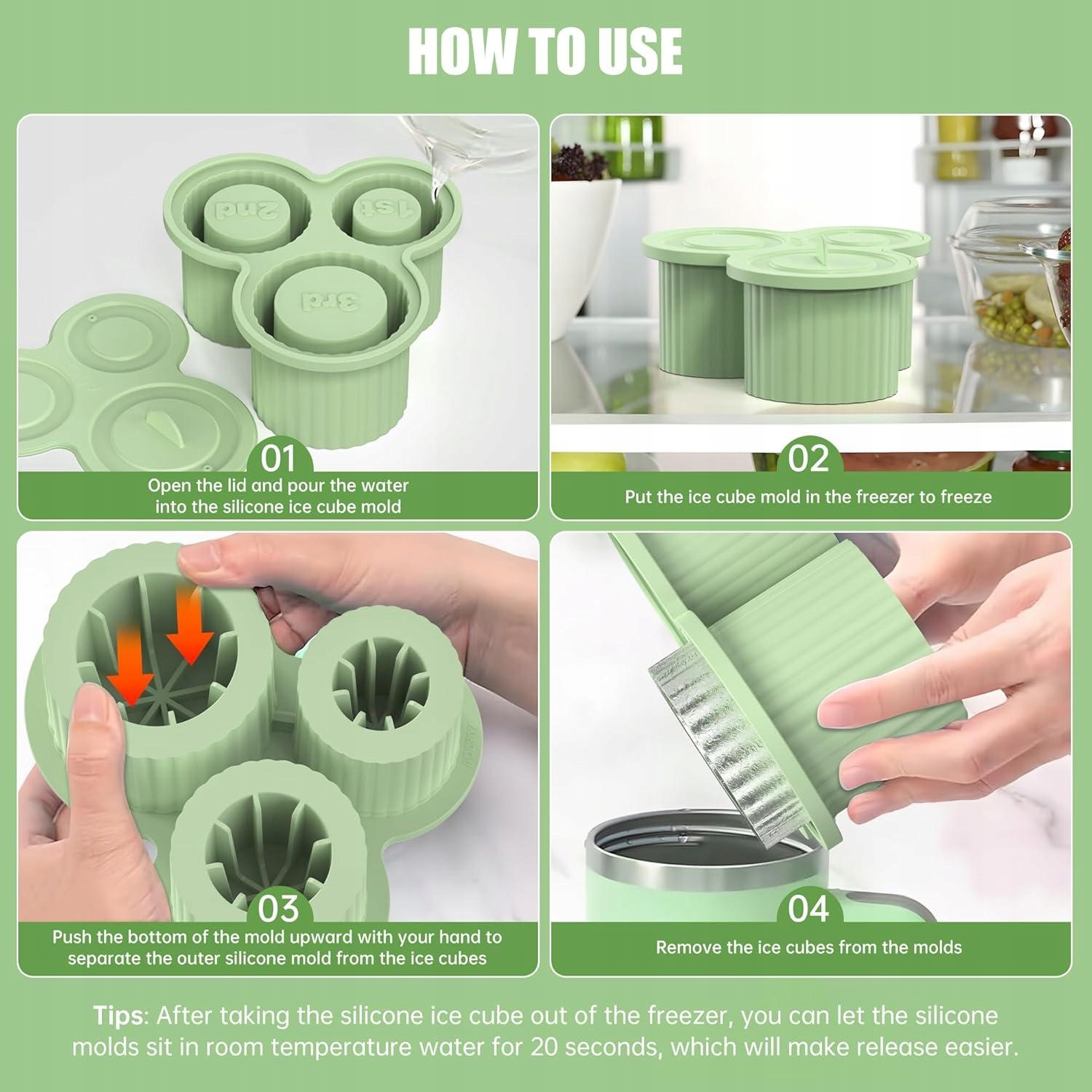 Specjalnie zaprojektowana tacka na kostki lodu do kubków – Ta tacka tworzy trzy duże kostki lodu, dzięki czemu Twoje napoje pozostaną zimne na dłużej. Dzięki powolnemu topnieniu tych dużych kostek lodu Twój napój pozostanie nierozcieńczony i zachowa swój oryginalny smak i jakość. Materiał silikonowy niezawierający BPA, dopuszczony do kontaktu z żywnością, bezpieczny w użyciu.
