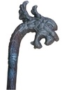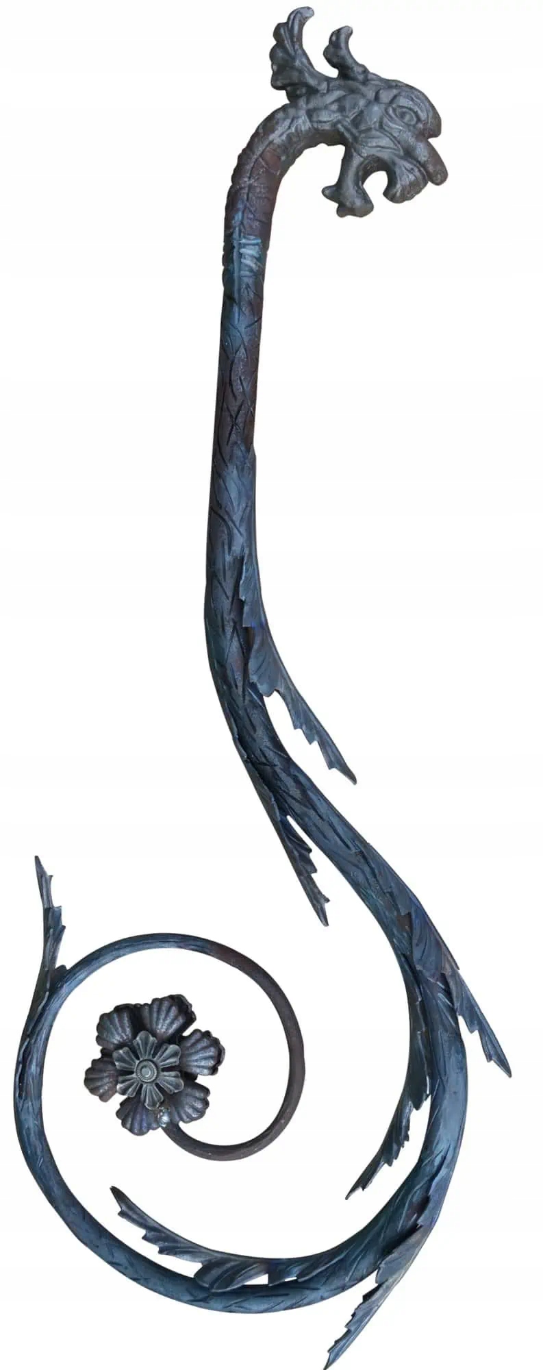 Stalowa, brzuchata tralka kuta, wykonana z rury i pręta z głową smoka . Tralki tego typu można wykorzystać do projektowania ogrodzeń oraz balustrad schodowych. Produkt w stanie surowym, do wykończenia we własnym zakresie.
