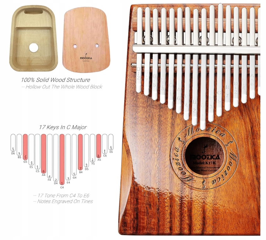 Moozica kalimba specjalizuje się w jakości dźwięku – wyselekcjonowane zęby z litego drewna i rudy metalu, aby upewnić się, że kalimba wytwarza łagodny, rezonujący i relaksujący dźwięk. Zabawa w kalimbę z dziećmi i ukochaną osobą zawsze będzie świetną zabawą!