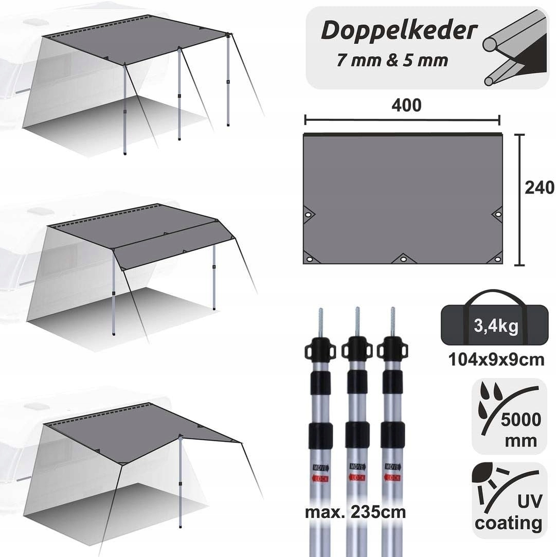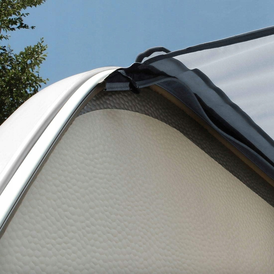 Markiza posiada podwójny keder (5 mm i 7 mm), który pasuje do większości standardowych szyn w przyczepach kempingowych. Montaż nie wymaga użycia narzędzi – wystarczy wsunąć markizę w prowadnicę i rozstawić słupki.
