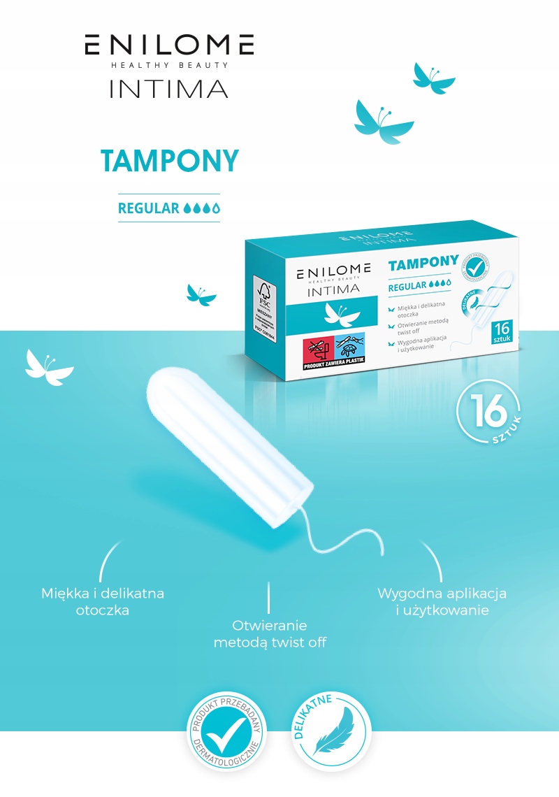 Enilome Healthy Beauty Intima tampony REGULAR to niezawodna ochrona w trakcie menstruacji, zapewniająca wygodę, świeżość i dyskrecję. Dzięki chłonnemu wkładowi skutecznie zabezpieczają przed przeciekaniem, a gładka powierzchnia i ergonomiczny kształt ułatwiają aplikację. Przeznaczone dla kobiet o umiarkowanym krwawieniu, zapewniają swobodę ruchów w każdej sytuacji – zarówno na co dzień, jak i podczas aktywności fizycznej.