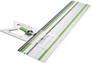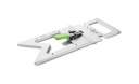 90°. Ani mniej, ani więcej. Ogranicznik wyfrezowany z jednego fragmentu aluminium gwarantuje precyzyjne i powtarzalne cięcia pod kątem prostym bez konieczności dodatkowej regulacji. Dzięki systemowi szybkiej wymiany, przykładnicę kątową można szybko przymocować do szyny prowadzącej, dzięki czemu w kombinacji z ręczną pilarką tarczową i stołem roboczym otrzymuje się mobilną pilarkę do płyt.