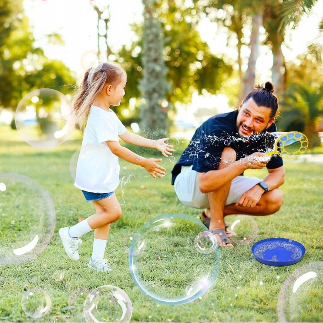 Łatwy w użyciu: bąbelki mydlane prosta obsługa, należy wlać roztwór baniek mydlanych do tacy na bąbelki, dokładnie wymieszać wodę różdżką do baniek i za pomocą prętów przepchnąć powietrze przez otwory, na koniec delikatnie machać różdżką, aby powstały bąbelki trzepoczą na wietrze i tworzą bajkową scenę (nie zawiera płynu do baniek mydlanych).