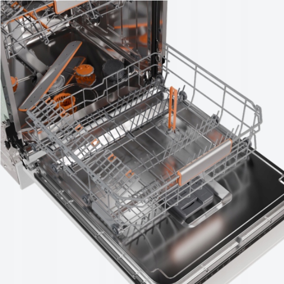 Kosze są wyposażone w wyraźnie oznaczone ruchome elementy, a konfigurowalny układ kosza znacznie ułatwia załadunek. Naprawdę prosty, dwustopniowy system regulacji kosza umożliwia dopasowanie nawet do największych garnków i talerzy. Stojak na talerze w dolnym koszu można łatwo złożyć. Sztućce można idealnie uporządkować na specjalnej tacy, gdzie są one umieszczone oddzielnie, co zapewnia doskonałe rezultaty czyszczenia i suszenia. Każdy szczegół został starannie zaprojektowany pod kątem jak najłatwiejszej obsługi.