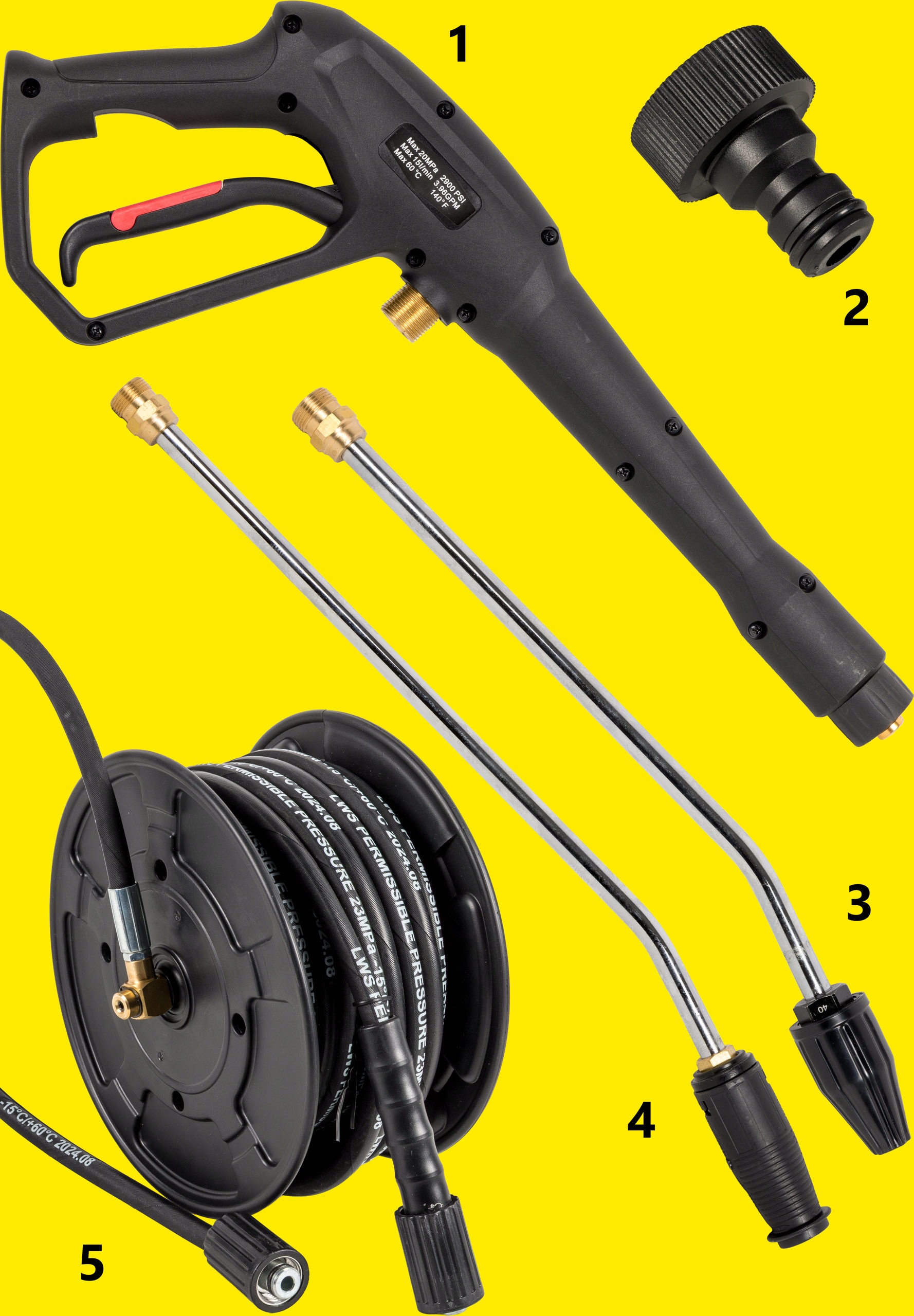 ✅ Zintegrowane akcesoria – bęben na wąż, uchwyt na pistolet i lancę zapewniają wygodną organizację pracy.