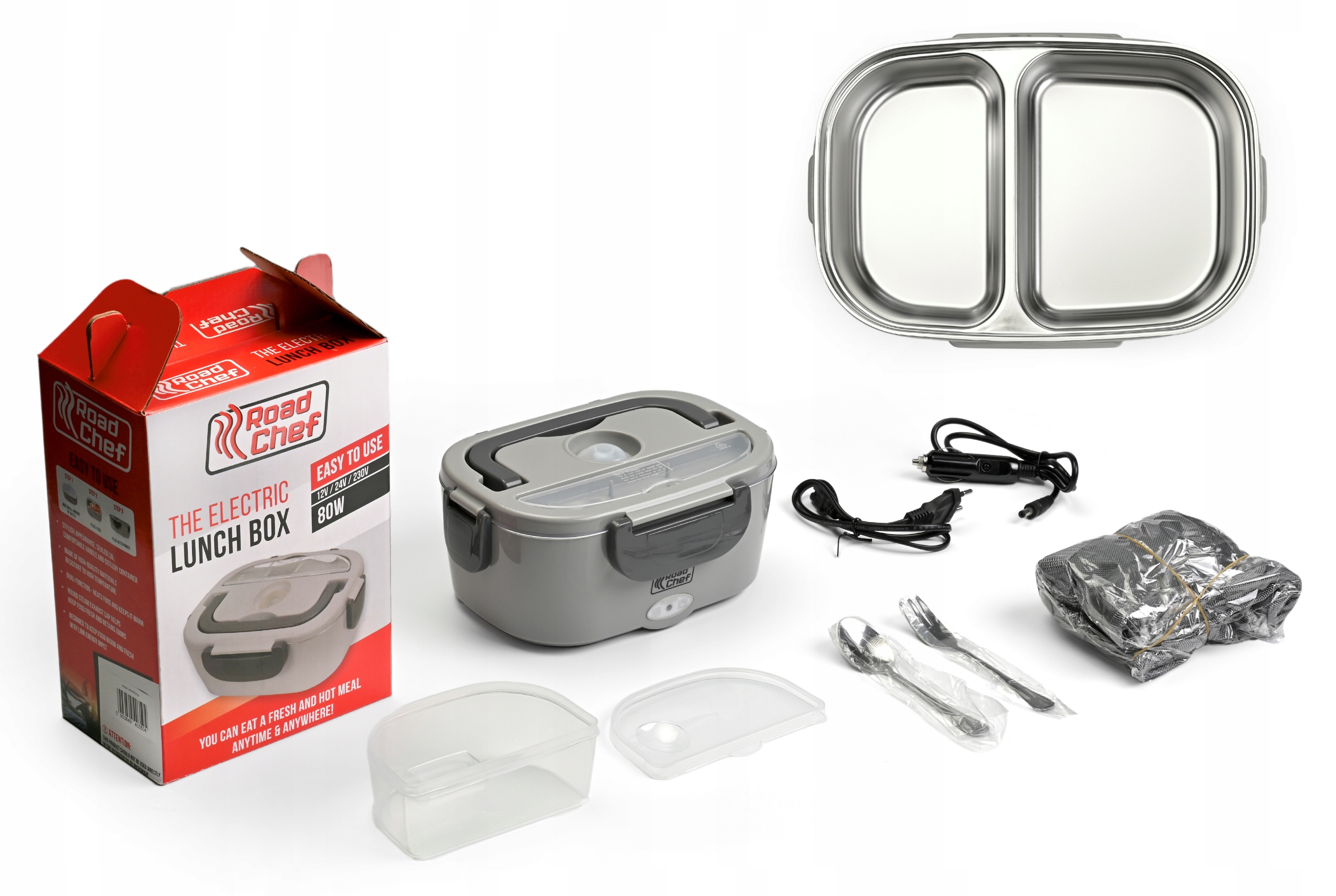 Elektryczny podgrzewacz na żywność Road Cheef to połączenie funkcjonalności i mobilności. Solidnie i estetycznie wykonane urządzenie wyposażone jest w element grzewczy PTC, który umożliwia podgrzanie jedzenia do 60° C w ciągu 20 minut. Żywność znajduje się w oddzielnym pojemniku wykonanym z metalu (INNOX) Podgrzewacz zamykany jest szczelnie na zatrzaski, które blokują dostęp powietrza. Dzięki temu posiłek zachowuje świeżość na dłużej. Lunch Box to rozwiązanie dla ludzi ceniących aktywność i zdrową dietę. Idealnie sprawdzi się w pracy, na studiach, w podróży, na działce i podczas wakacji na kempingu.
