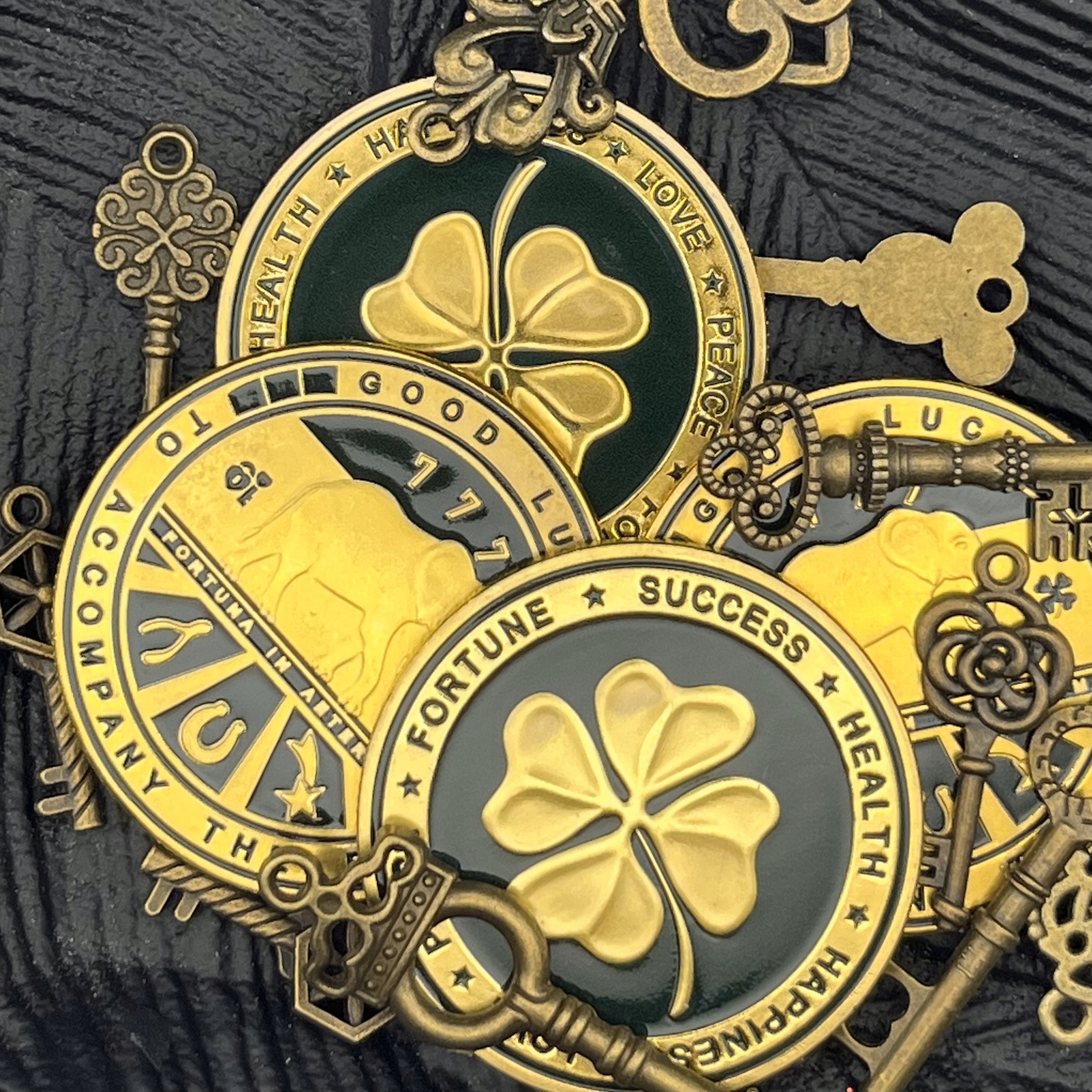 Przyciągnij szczęście i dobrobyt dzięki tej wyjątkowej złotej monecie, która łączy w sobie potężne symbole pomyślności. Czterolistna koniczyna, słoń i liczba 777 to uniwersalne znaki szczęścia i powodzenia, a napis „Fortuna in Aeternum” (Szczęście na wieczność) dodaje monecie wyjątkowego znaczenia.
