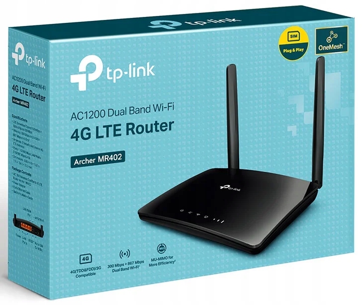 Archer MR402 to dwupasmowy, bezprzewodowy router 4G LTE AC1200. Nowoczesna sieć 4G, udostępniaj połączenie internetowe nawet 64 urządzeniom Wi-Fi jednocześnie i pobieraj pliki z prędkością dochodzącą do 150 Mb/s. Dwa pasma sieci Wi-Fi oferujące 300 Mb/s w paśmie 2,4 GHz i 867 Mb/s w paśmie 5 GHz. Plug and Play - włóż kartę SIM i korzystaj z urządzenia. Żadna konfiguracja nie jest potrzebna. Dwie odkręcane anteny LTE zapewniają stabilność i wydajność połączeń. Tryb routera Wi-Fi - podłącz przewód Ethernet do portu LAN/WAN i korzystaj z połączeń przewodowych w przypadku braku dostępu do sieci 4G.