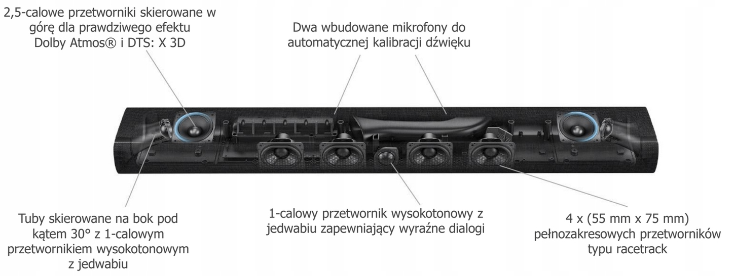 Technologia MultiBeam™ wypełnia pomieszczenie dźwiękiem bez dodatkowych przewodów i głośników. Dziewięć przetworników buduje pełny, bogaty dźwięk. Dwa skierowane do góry kanały zapewniają efekty True Dolby Atmos, a technologia PureVoice gwarantuje, że nigdy nie przegapi się żadnej kwestii z dialogu. Elegancka, minimalistyczna obudowa soundbara Harman Kardon Enchant 900, wykonana częściowo z materiałów pochodzących z recyklingu, doskonale pasuje do wystroju każdego pokoju. Funkcja Ultra HD 4K Pass-Through z technologią Dolby Vision™ pozwala uzyskać najlepszą możliwą jakość obrazu, dzięki kompatybilnym źródłom multimediów. Wystarczy podłączyć urządzenie za pomocą wejścia HDMI na uproszczonym panelu przyłączeniowym. Harman Kardon Enchant 900 jest zgodny z praktycznie wszystkimi dostępnymi na rynku telewizorami i umożliwia bezpośrednie połączenie z najwyższej jakości, nieskompresowanym dźwiękiem przestrzennym Dolby Atmos®.