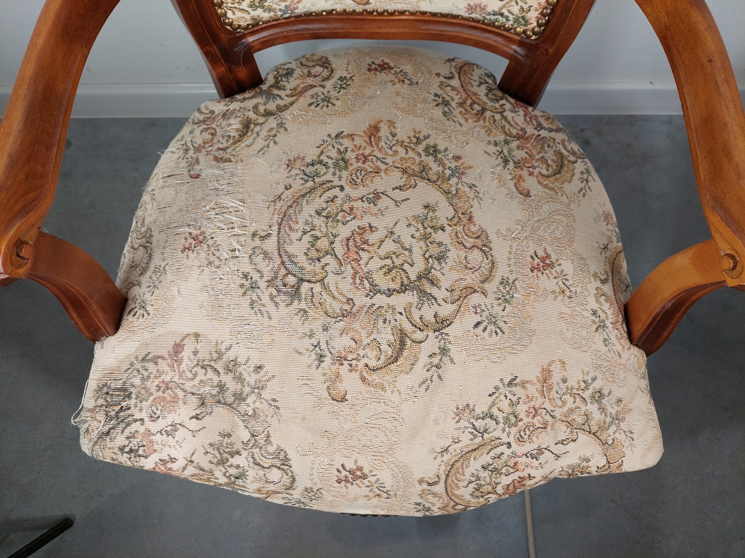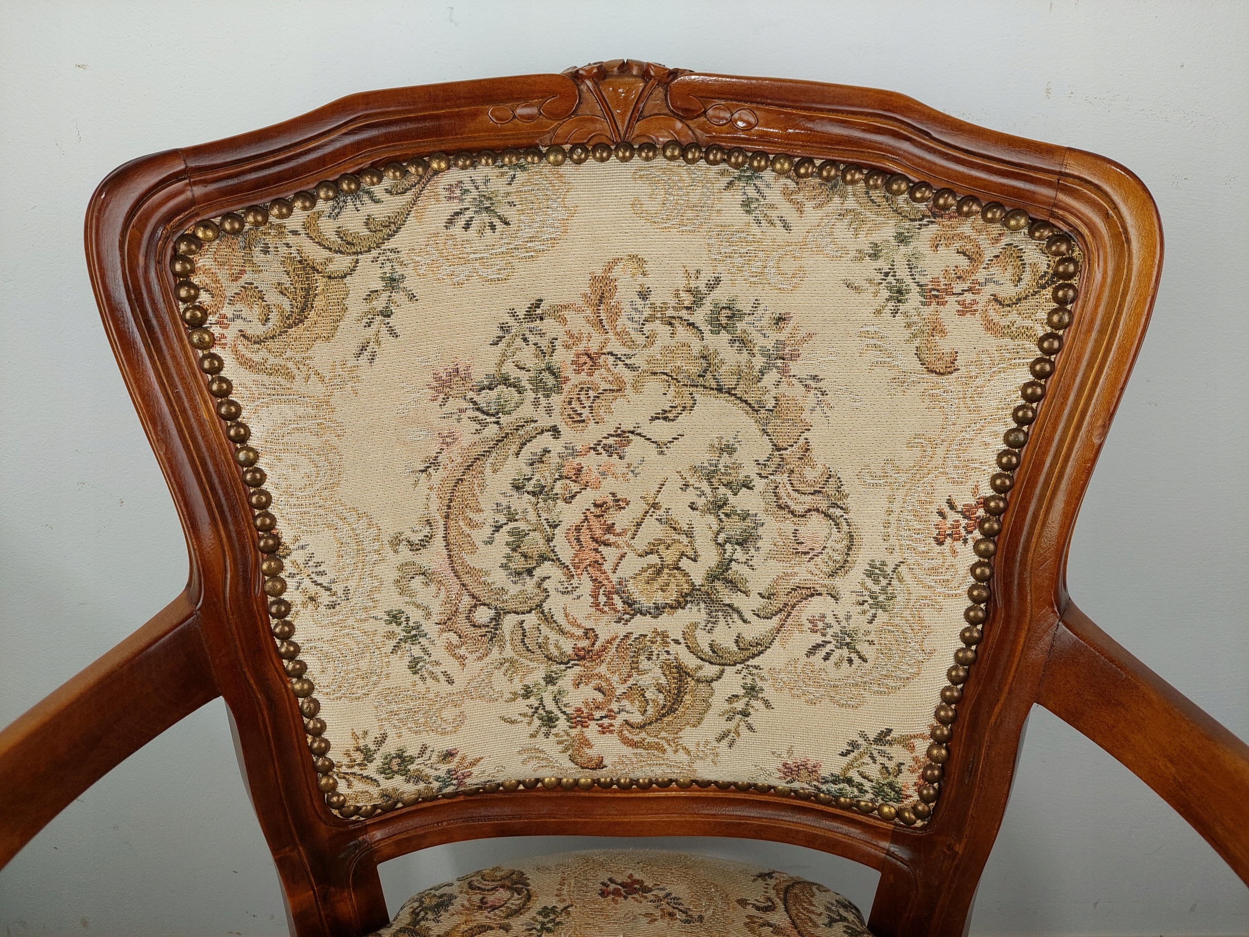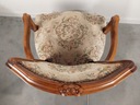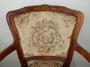 Stylowy dębowy fotel ludwikowski tapicerowany w kolorze beżowym z kwiatowymi motywami, na giętych nogach. Mebel posiada ślady użytkowe, tapicerka do zmiany, w całości stabilna oryginalna konstrukcja ( siedzisko na sprężynach wspartych pasami). Szczegóły na zdjęciach poniżej .