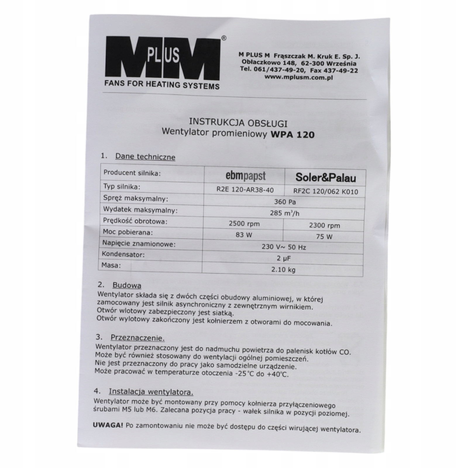 Rodzaj urządzenia: Wentylator Promieniowy (z łopatami pochylonymi do przodu)