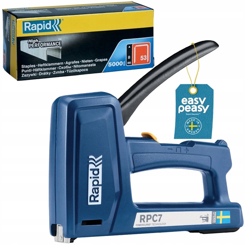 RPC7 może pracować przy użyciu zszywek z drutu cienkiego, płaskiego, zszywek do kabli, sztyftów oraz szpilek. Obszary zastosowań tego zszywacza są zatem niezwykle liczne: tapicerka meblowa, cienkie materiały drewniane, masonit, bariery przeciwwilgociowe i paroizolacyjne, folie z tworzyw sztucznych, kable niskiego napięcia, zszywanie delikatnych i cienkich materiałów tekstylnych oraz prace w ogrodzie, takie jak klatka dla królików i wiele innych. Opatentowana technologia Powercurve firmy Rapid zmniejsza siłę wymaganą do zszywania o nawet 50%. To sprawia, że RPC7 jest odpowiednim narzędziem do wszechstronnych zastosowań, a także wygodnym, szybkim i łatwym w obsłudze w porównaniu do tradycyjnych zszywaczy. 2-stopniowa regulacja siły wbijania pozwala zoptymalizować zapotrzebowanie na moc w zależności od długości zszywek i grubości materiału. Ergonomiczny RPC7 został wyprodukowany w Szwecji z odpornego na uderzenia tworzywa ABS, a jego części robocze wykonano z najwyższej jakości stali.