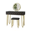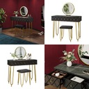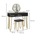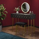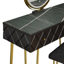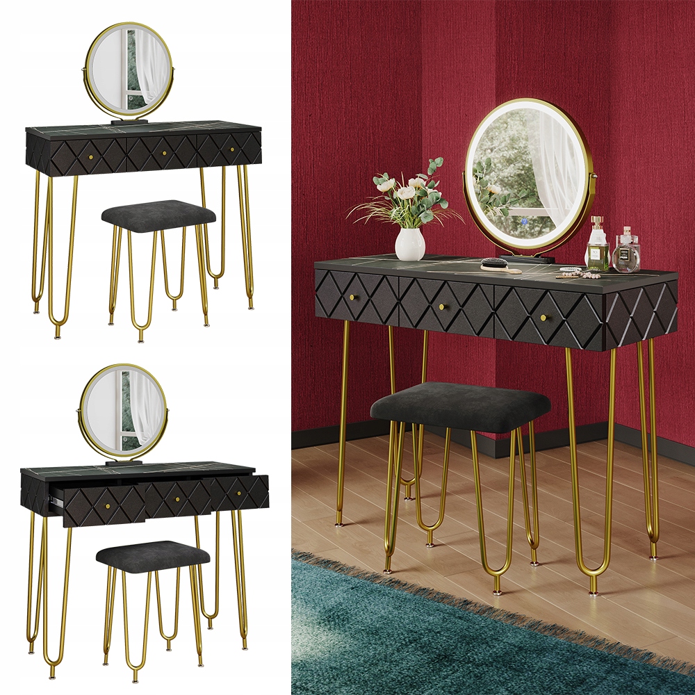 Ciesz się eleganckim designem dzięki dołączonemu lusterku LED - idealnemu oświetleniu Twojego makijażu i stylizacji. Wygodny taboret zapewnia wygodne miejsce do siedzenia podczas wykonywania makijażu i fryzjerstwa. Pojemne szuflady zapewniają wystarczająco dużo miejsca do przechowywania kosmetyków. Łatwa w pielęgnacji powierzchnia pozwala na łatwe czyszczenie i pozwala zachować piękno toaletki.{b}Dane techniczne:{/b}{b}Kolory:{/b}Marmur, Czarny{b}Wymiary:{/b}100 x 79.5 x 40 cm (szer. x wys. x gł.){b}Materiał:{/b}Płyta wiórowa, 16 mm{b}Powierzchnia:{/b}Powłoka z żywicy melaminowej{b}Waga netto bez opakowania:{/b}22.11 kg{b}Masa brutto wraz z opakowaniem:{/b}23.1 kg