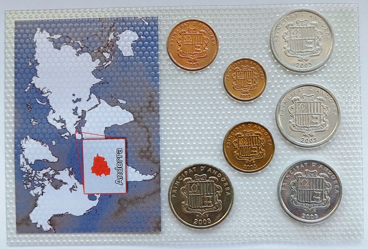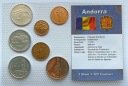 Kompletny zestaw 7 monet z Andory, wybitych w 2003 roku, w stanie menniczym (UNC), zapakowany w blister. Monety przedstawiają motywy związane z dziedzictwem kulturowym i przyrodniczym Andory.