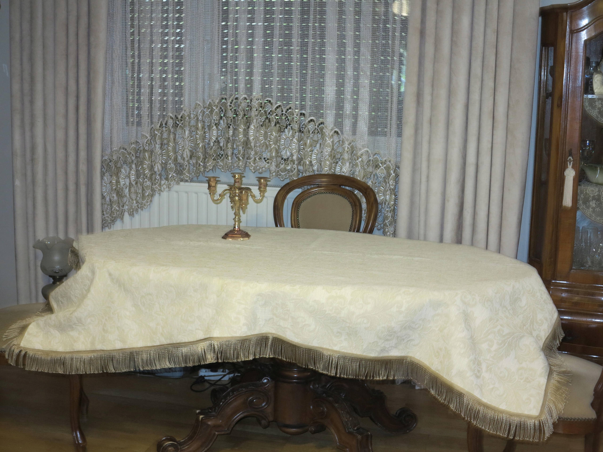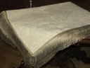 Przedmiotem aukcji jest niezwykle piękny stylowy, duży, gobelinowy obrus, zdobiony złotymi frędzlami. Obrus ma wymiary: 195/132cm plus 7cm frędzle. Obrus używany, w super dobrym stanie i jakości, pomimo swojego wieku. Polecam, doskonała ozdoba stylowego wnętrza.