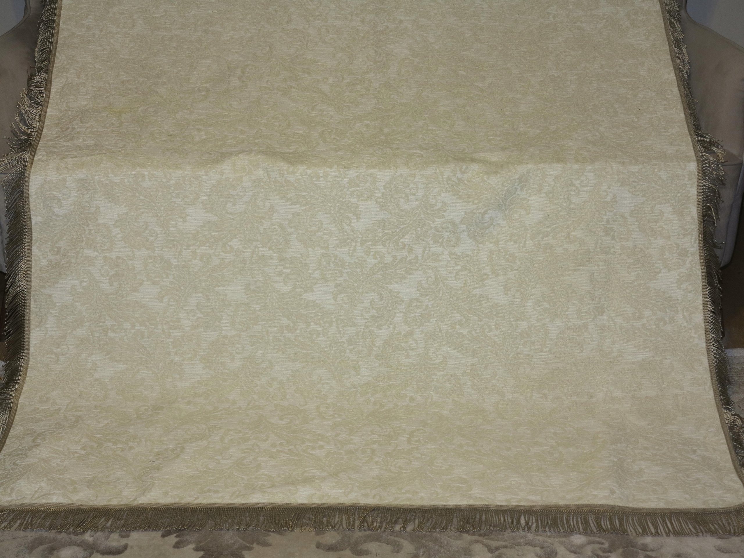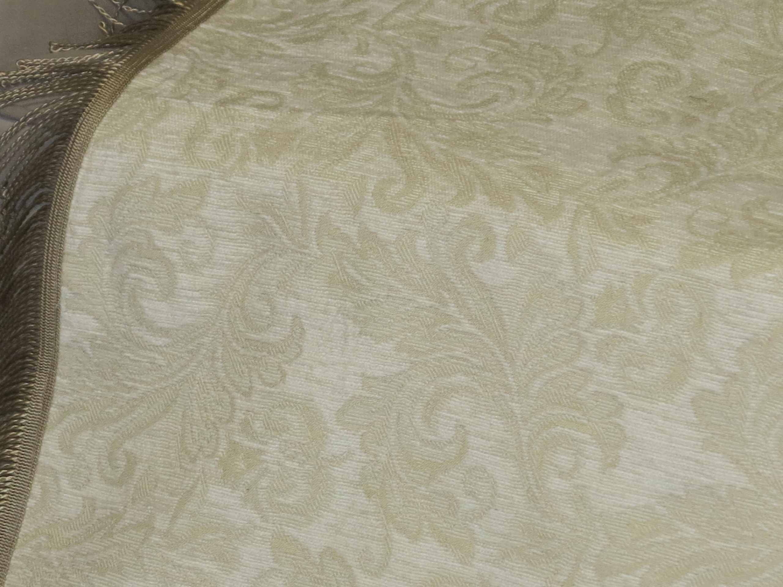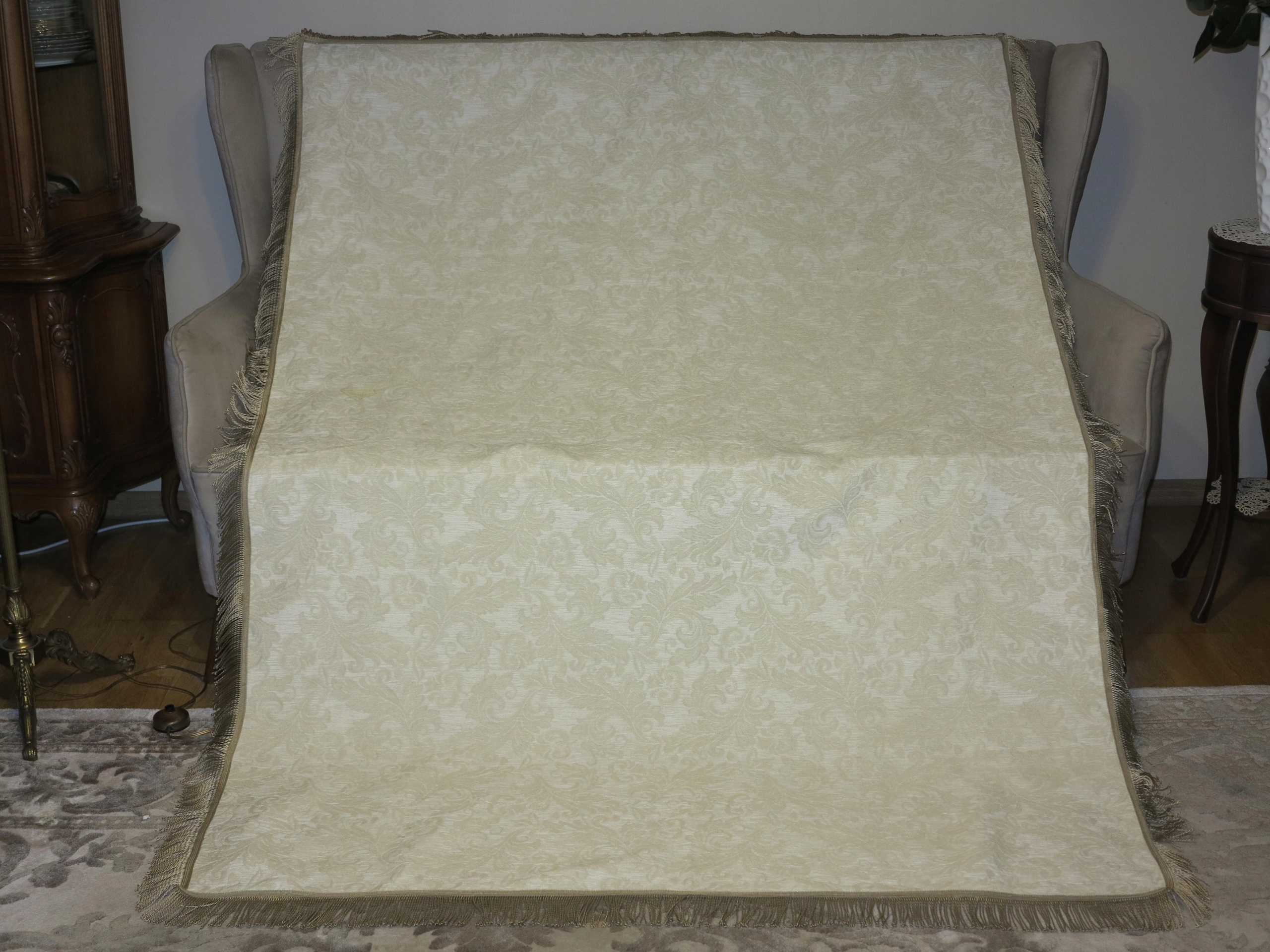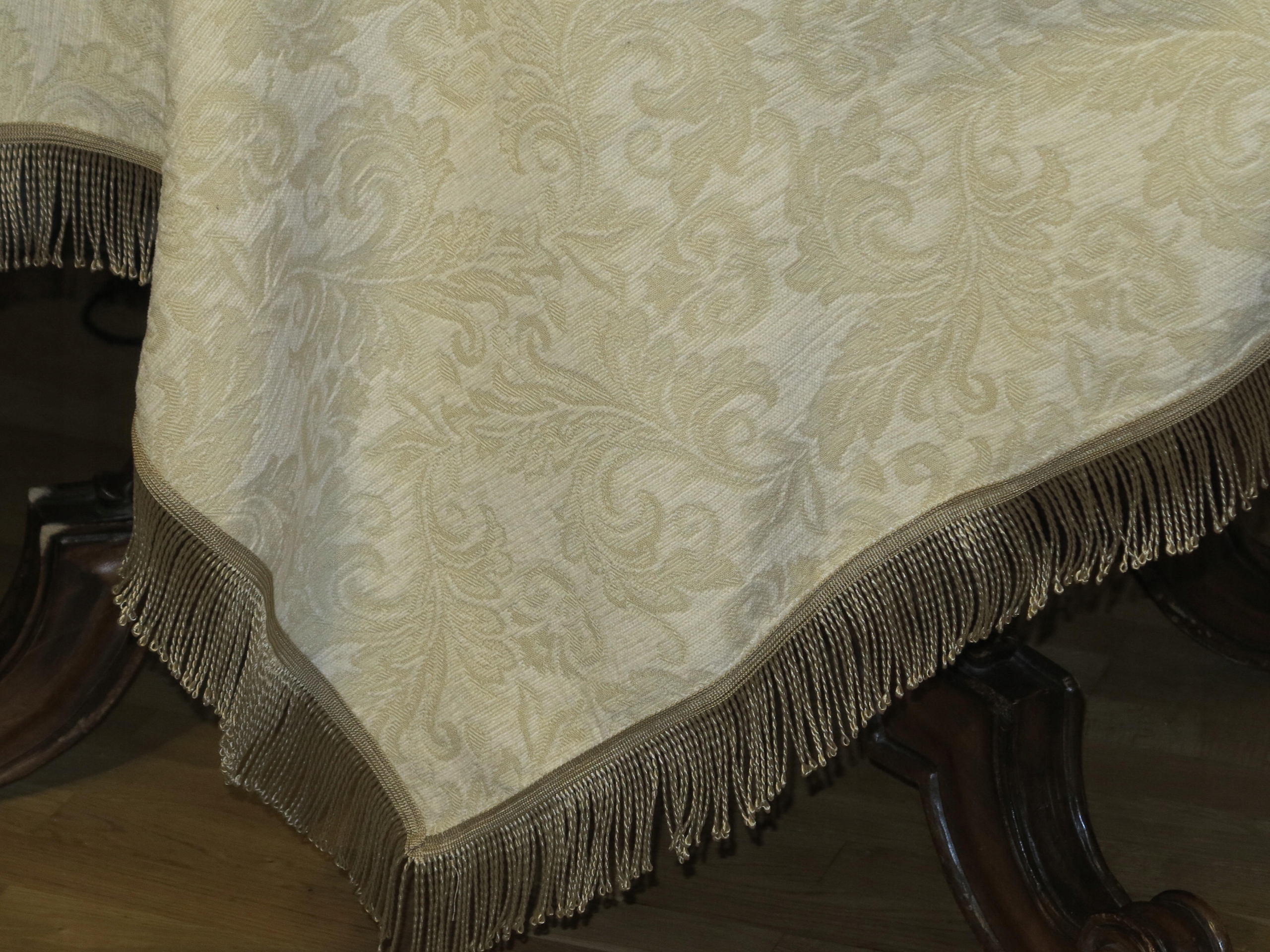 DLA KONESERA - WYJĄTKOWO PIĘKNY OBRUS Z SOLIDNEGO GOBELINU AKSAMITNEGO W ECRU, W STYLOWE ZŁOTAWE WZORY. NA OKOŁO WYKOŃCZONY ZŁOTYMI FRĘDZLAMI