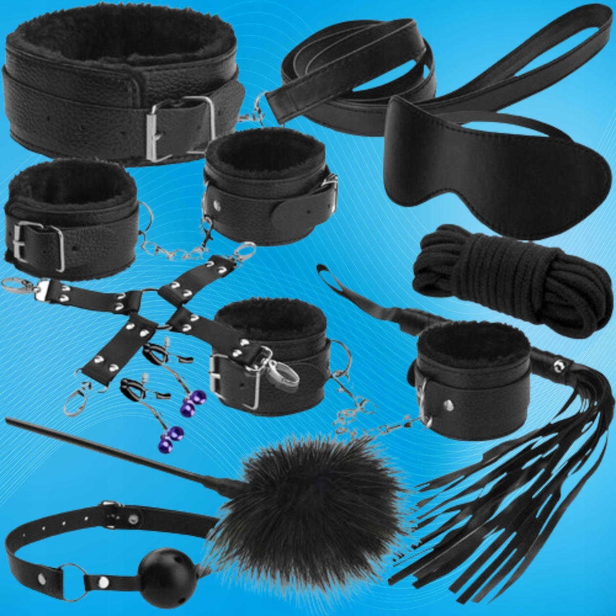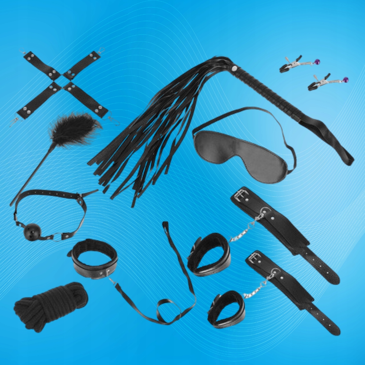 Zawiera wszystko, co potrzebne do rozpoczęcia lub pogłębienia przygody z BDSM – od kajdanek, przez knebel, aż po piórko i zaciski na sutki.