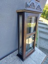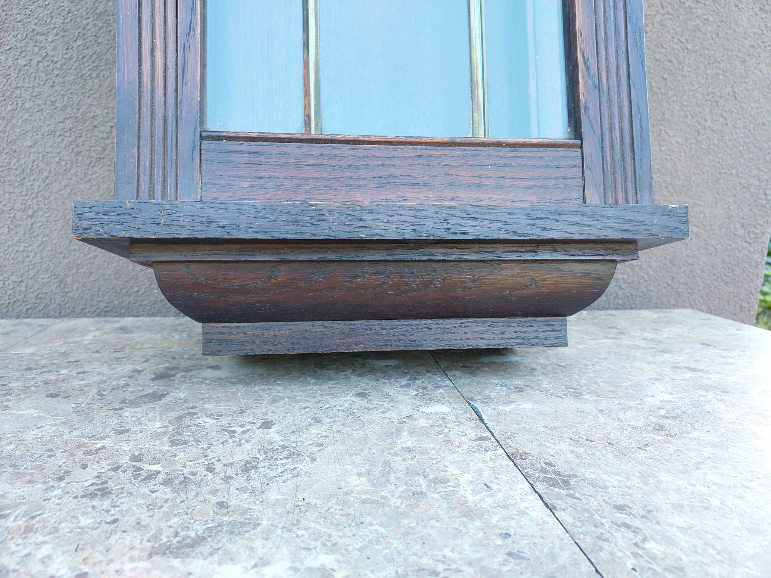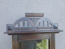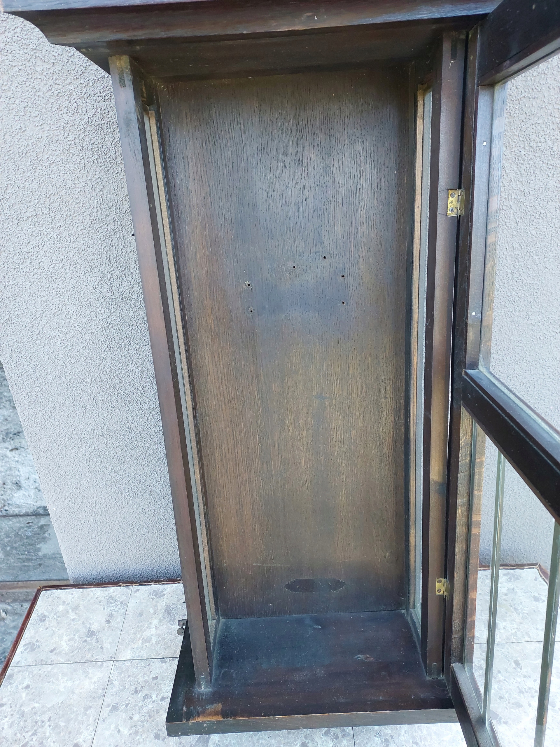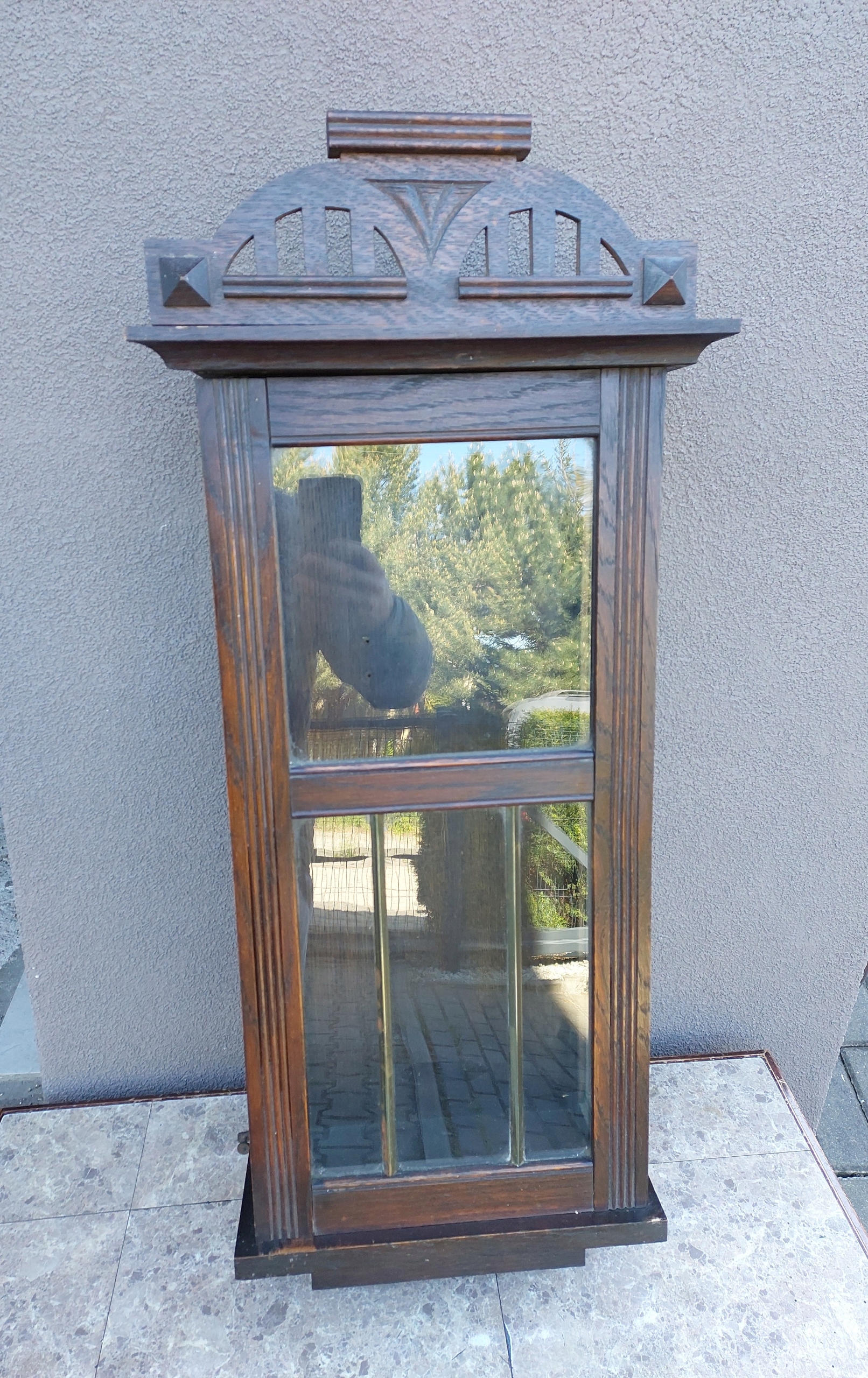 Do sprzedania szafka witrynka obudowa starego przedwojennego zegara ściennego, z 1913r, boki oszklone, front oszklony, dolne szkło zdobione mosiężnymi szprosami, u szczytu korona, brak górnej bocznej listwy, może służyć jako szafka na drobiazgi witrynka apteczka itp, wymiary wysokość 81cm, szerokość 35,5cm, głębokość 17cm, wymiar w środku 60x23x10cm