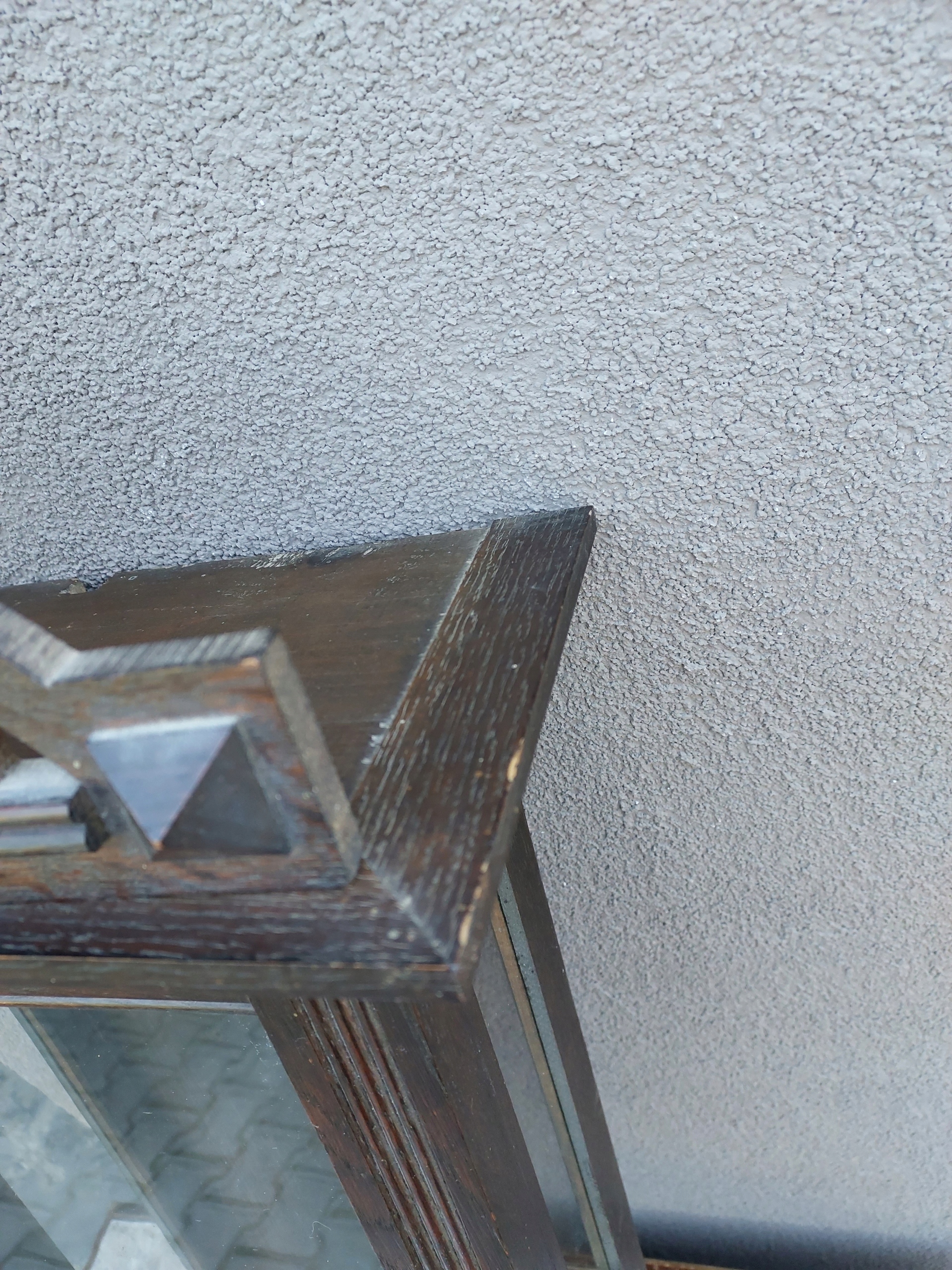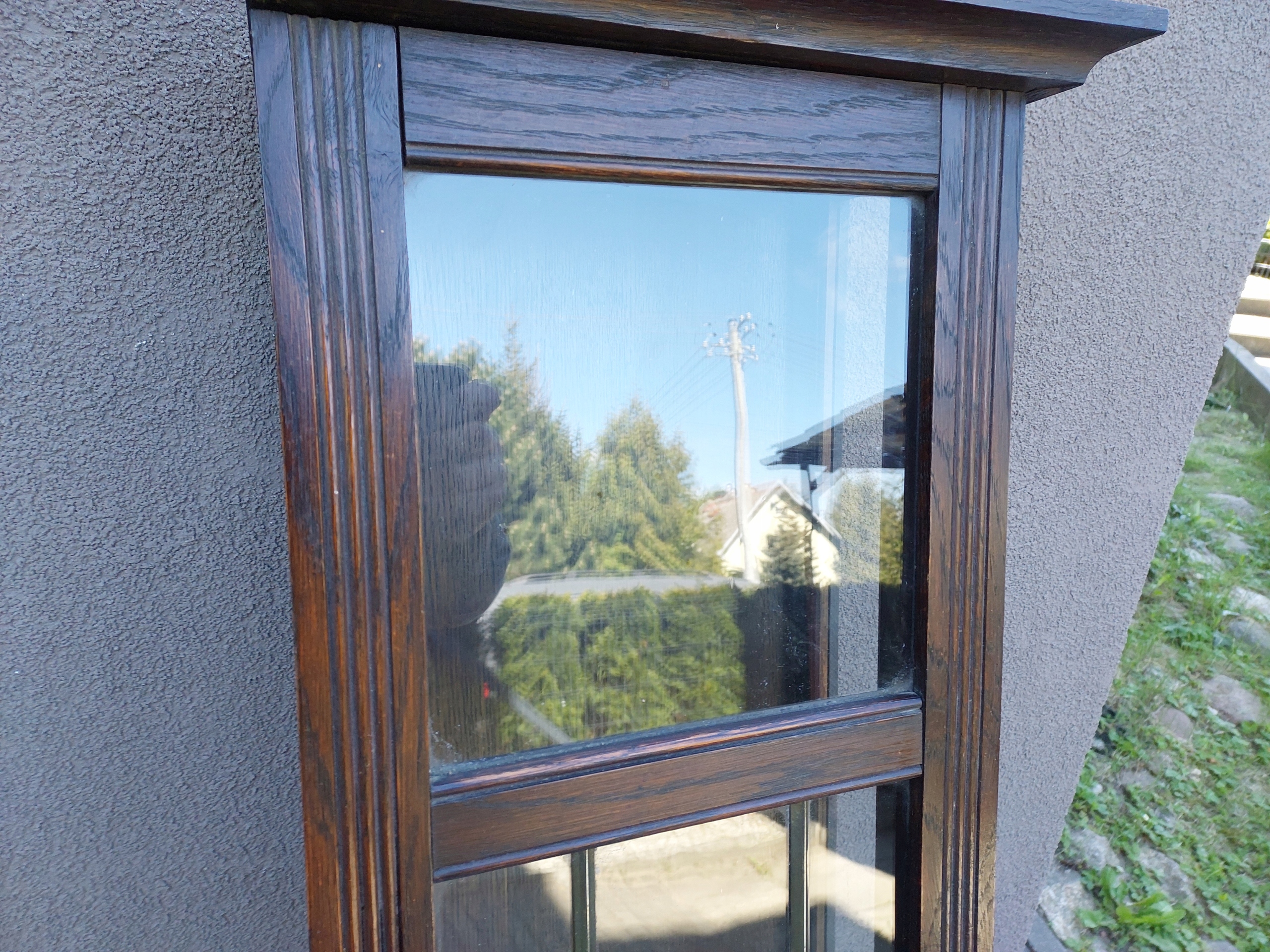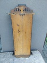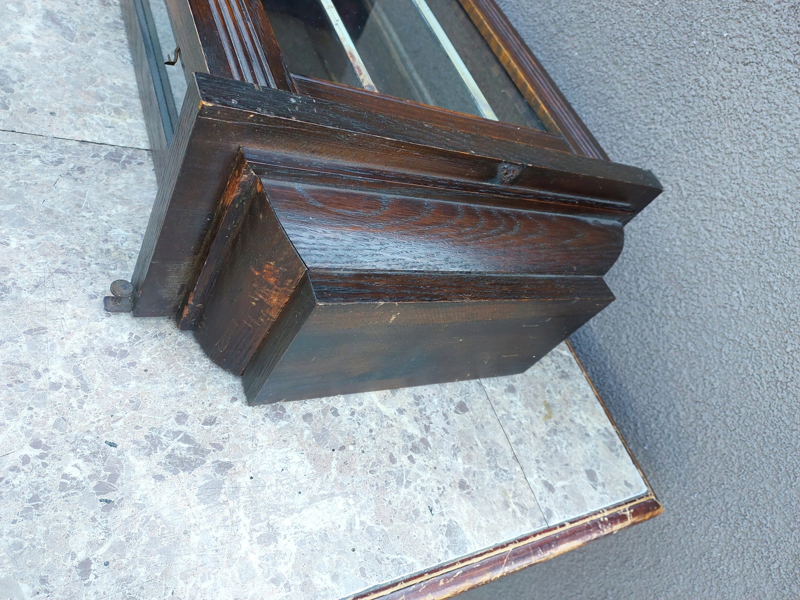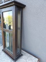 Do sprzedania szafka witrynka obudowa starego przedwojennego zegara ściennego, z 1913r, boki oszklone, front oszklony, dolne szkło zdobione mosiężnymi szprosami, u szczytu korona, brak górnej bocznej listwy, może służyć jako szafka na drobiazgi witrynka apteczka itp, wymiary wysokość 81cm, szerokość 35,5cm, głębokość 17cm, wymiar w środku 60x23x10cm