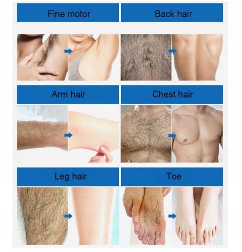 Części, które można depilować: uda, plecy, ramiona, pachy, talia itp.