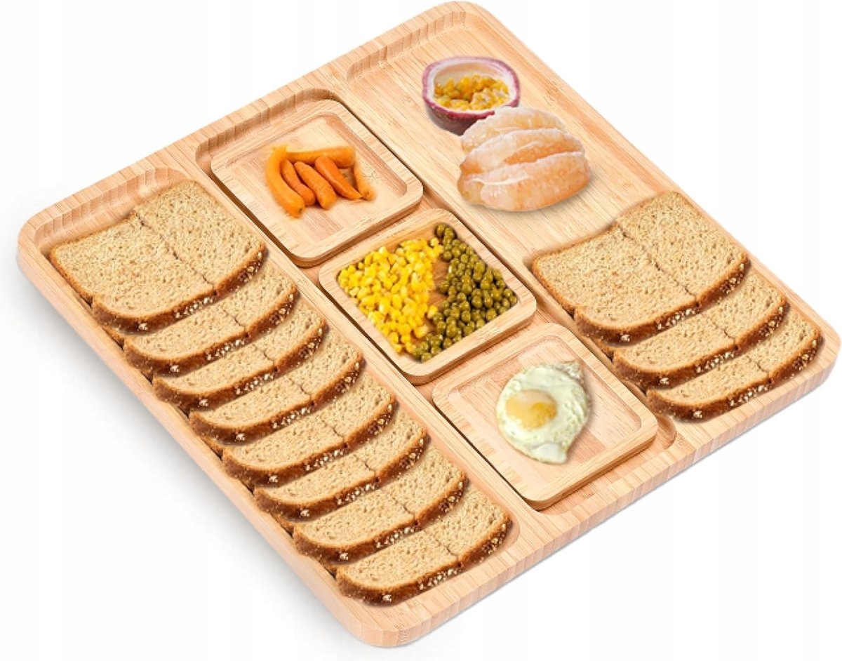 Praktyczny design: Dzięki 5 przegródkom ta deska idealnie nadaje się do porcjowania i serwowania różnych przekąsek.