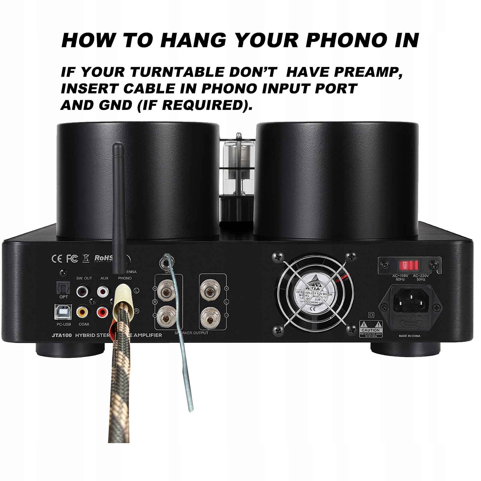 Если ваш проигрыватель не имеет функции предусилителя, вставьте кабель во входной порт проигрывателя и GND (если требуется)