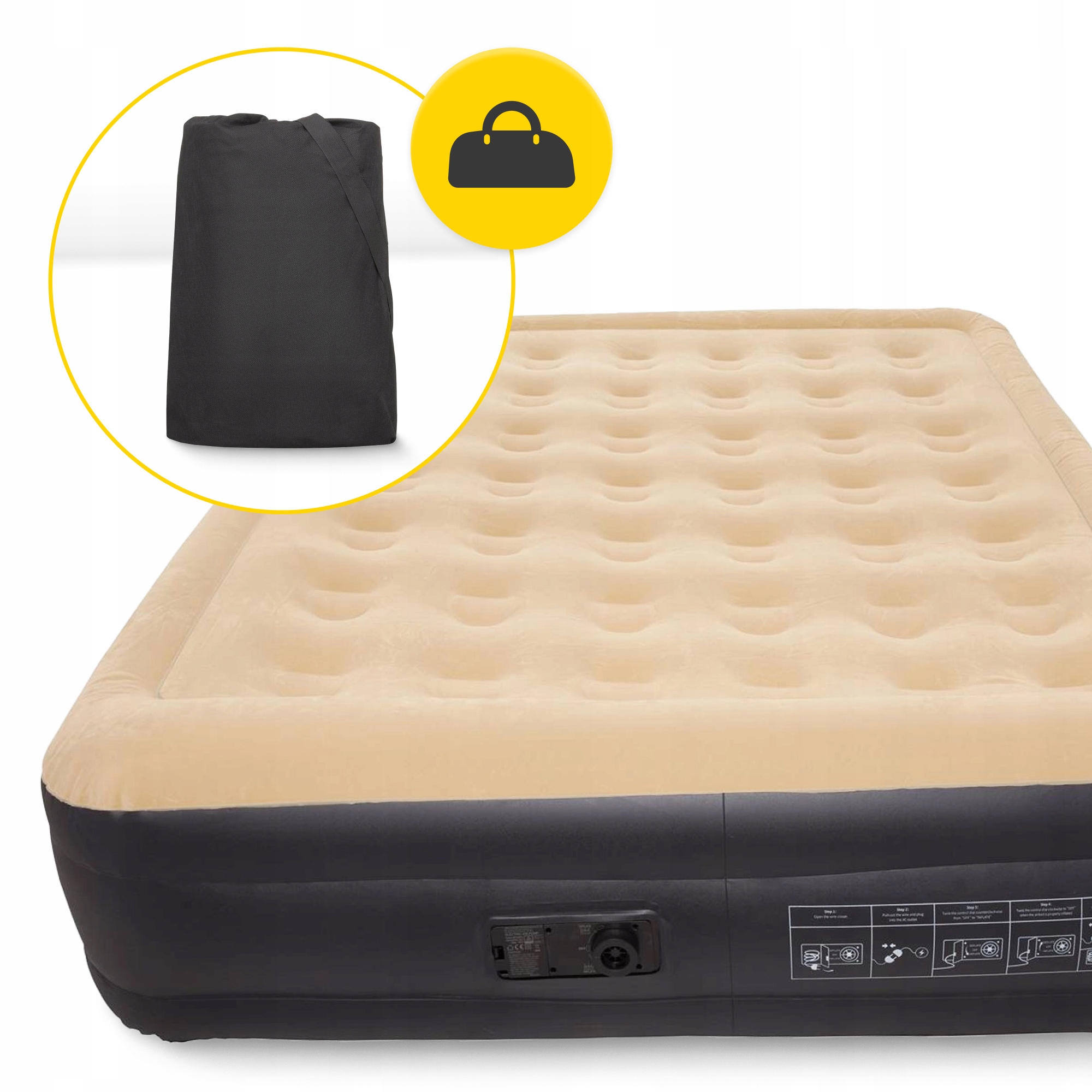 Wbudowana pompka elektryczna umożliwia zarówno szybkie nadmuchiwanie, jak i opróżnianie materaca. Tym samym zaoszczędzisz czas i wysiłek, a także wyeliminujesz trudności związane z pakowaniem materaca po zakończeniu wyjazdu. Nie obciąży on bagażu, a po sezonie bez trudu schowasz go w szafie.