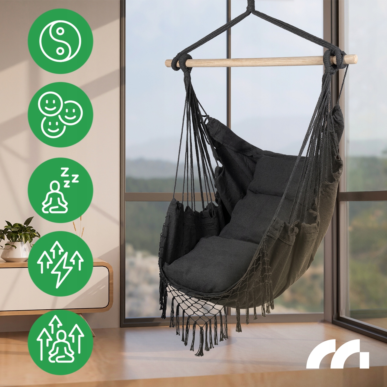 Dzięki drewnianemu stelażowi hamak jest nie tylko estetyczny, ale także bardziej funkcjonalny. Zapewnia on stabilność, a jednocześnie zapobiega plątaniu się sznurów, co dodatkowo podnosi trwałość tego wyjątkowego krzesła.