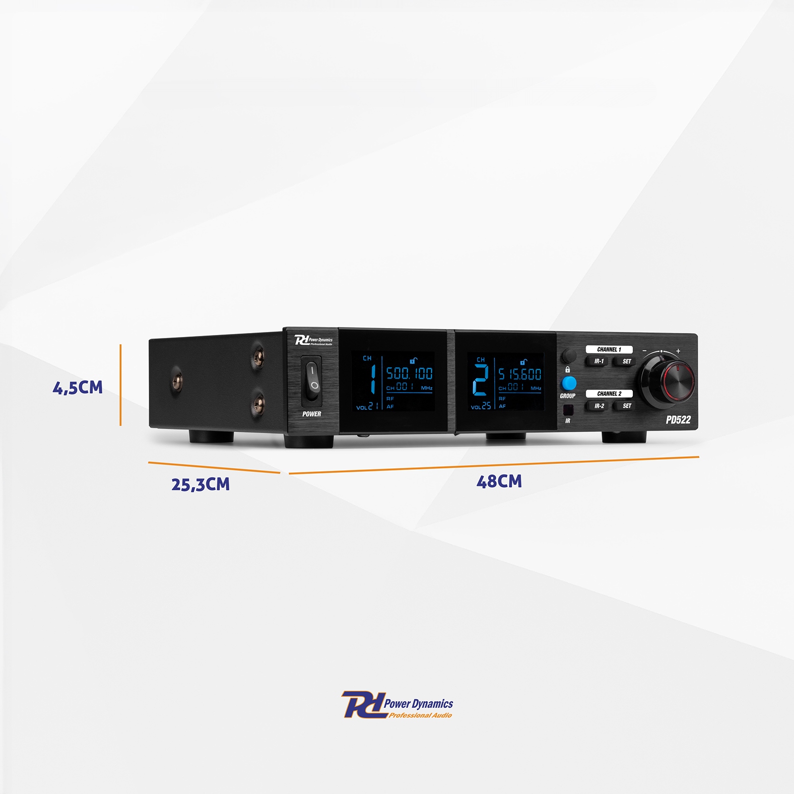 Odbiornik PD522 również posiada wyraźny ekran LCD, który umożliwia łatwy odczyt częstotliwości, kanału oraz poziomu głośności. Za pomocą przycisków na przednim panelu możesz sprawnie zarządzać ustawieniami systemu. Dodatkowym atutem jest port USB z tyłu urządzenia, który umożliwia ładowanie mikrofonów (kolejno, jeden po drugim). Dzięki wyjściu XLR bez problemu podłączysz system do miksera, wzmacniacza lub kontrolera DJ. Odbiornik można także zamontować w standardowej szafie rack 19", co pozwala na zachowanie porządku i estetyki.