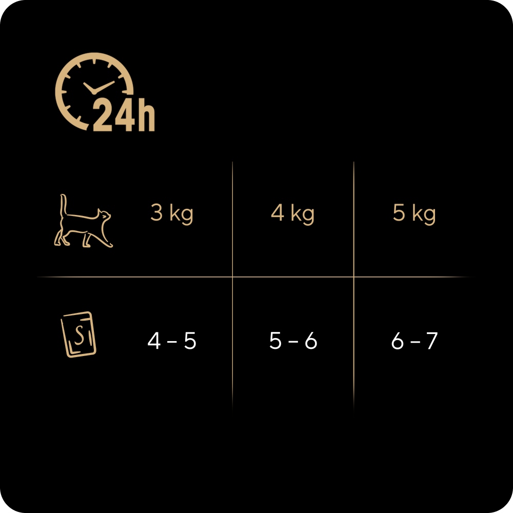 Należy uwzględnić kalorie pochodzące z przysmaków. Ilości karmy są podane wyłącznie jako wskazówki. Należy dostosować ilość karmy do wieku, rozmiaru i poziomu aktywności kota. Zapewnij świeżą wodę do picia. Podawać o temperaturze pokojowej, niewykorzystaną część przechowywać w lodówce do 2 dni.