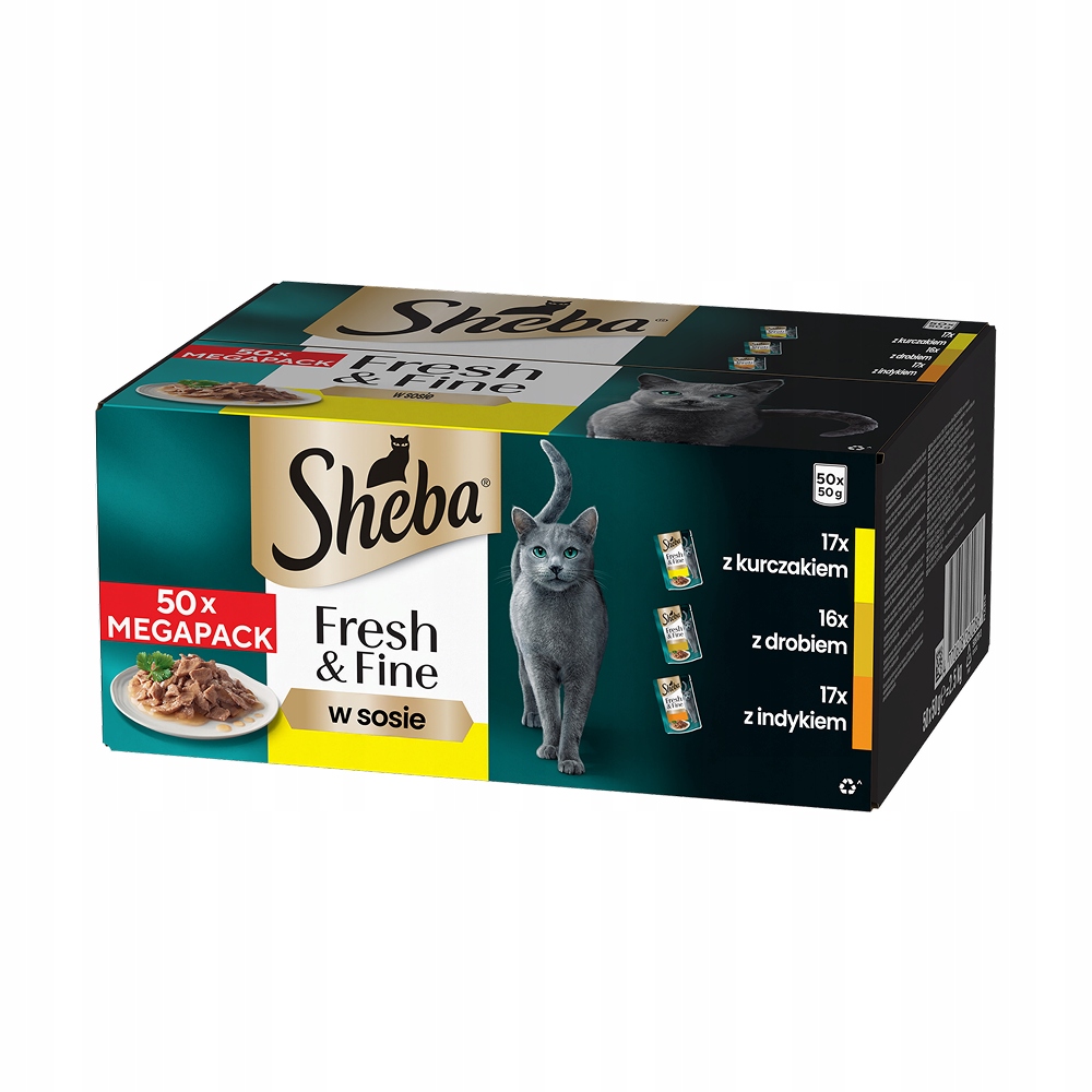 SHEBA Fresh & Fine to wyśmienity, pełnoporcjowy pokarm dla dorosłych kotów. Pozwól swojemu kotu rozsmakować się w trzech wyjątkowych smakach: z kurczakiem, z drobiem, z indykiem. Zobacz jak Twój koci przyjaciel ucieszy się, gdy podasz mu delikatne kawałki zanurzone w jedwabistym sosie.