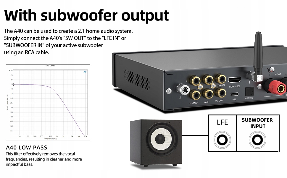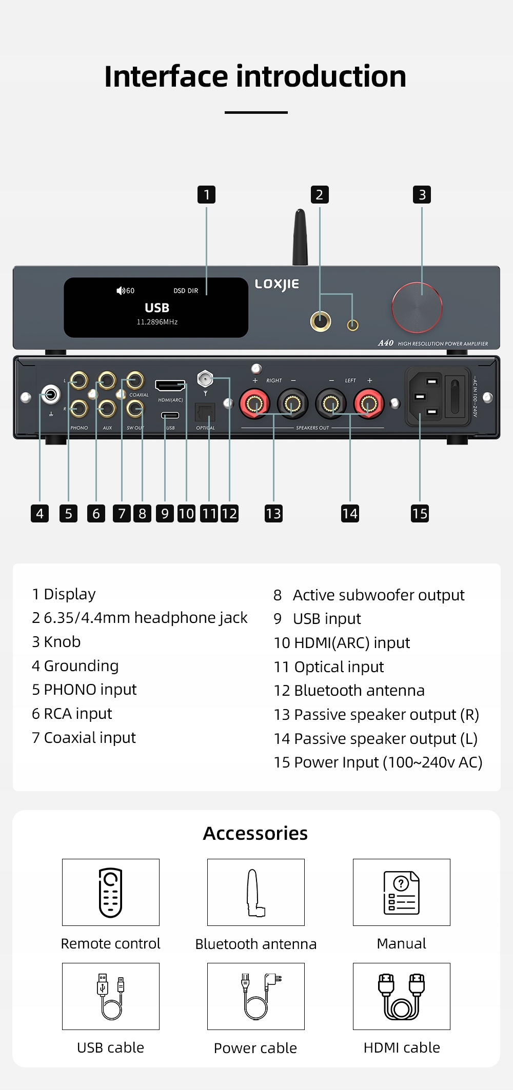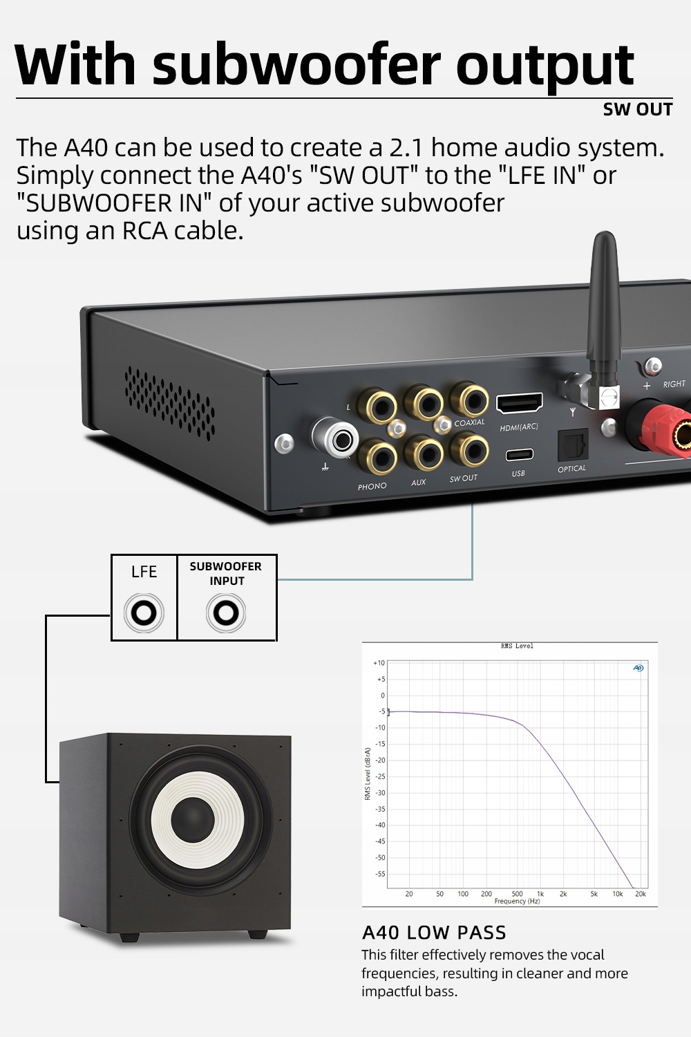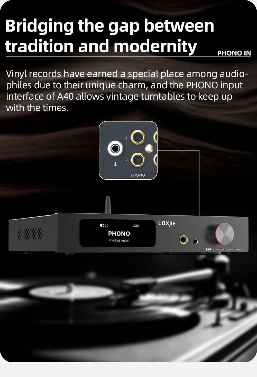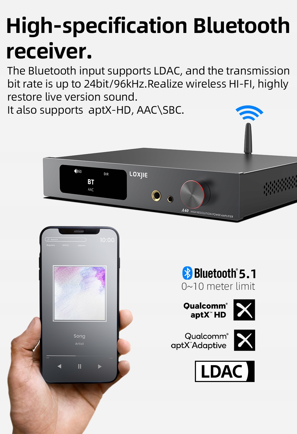 Wejście ma więcej opcji, obsługuje Phono, Cinch, Coaxial, HDMI (ARC), Optical, USB i Bluetooth. Bluetooth obsługuje LDAC, APTX-HD, AAC/SBC. Duża liczba audiofilskich komponentów audio poprawiających subiektywny zmysł słuchu i wbudowany wysokiej jakości zasilacz impulsowy audio o wysokiej wydajności.