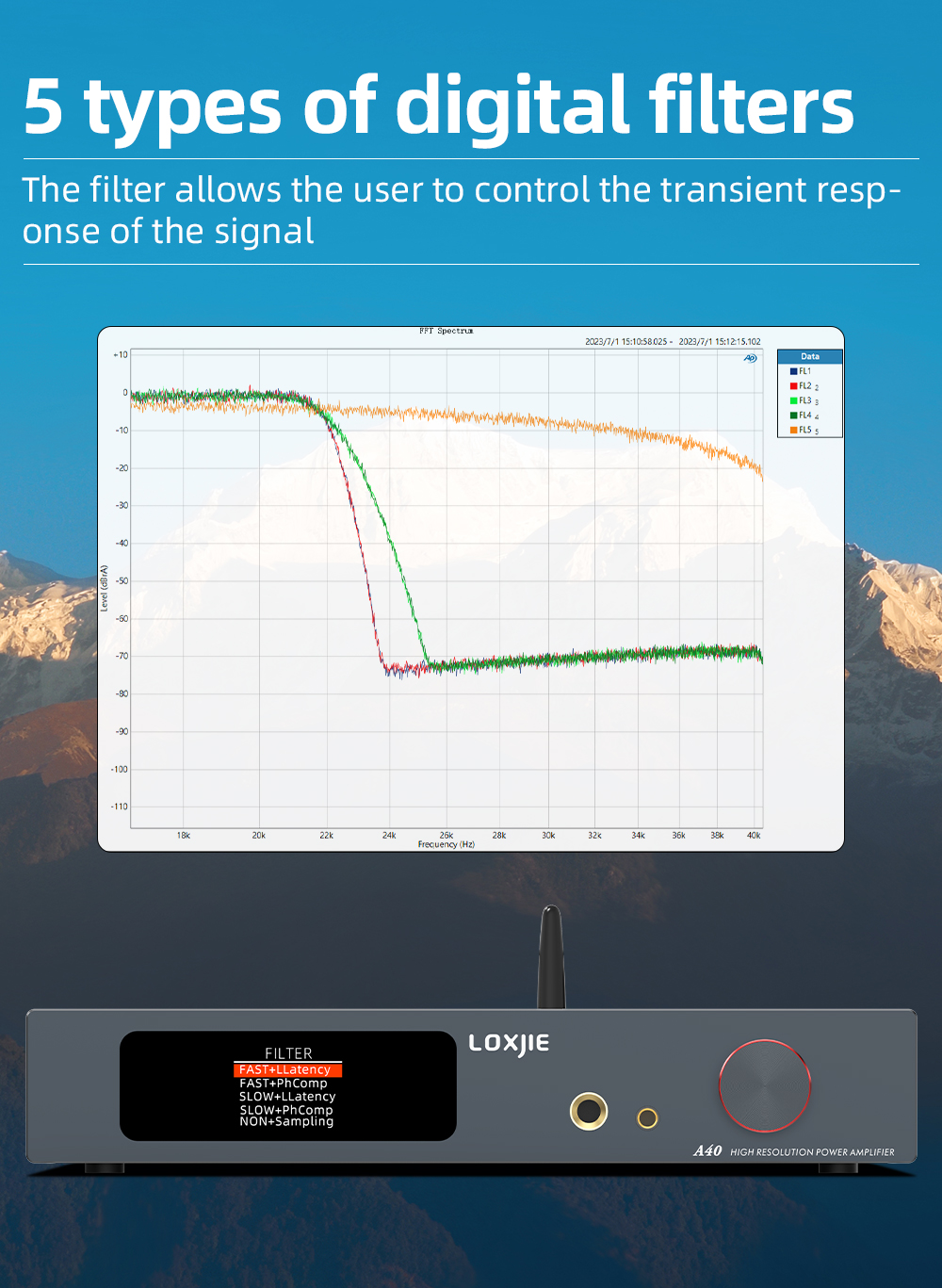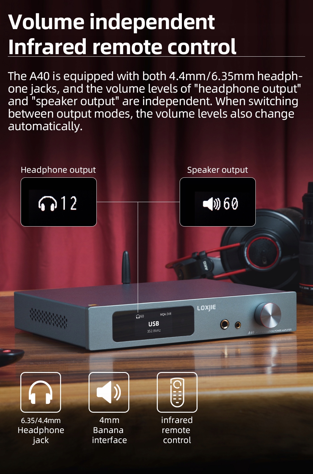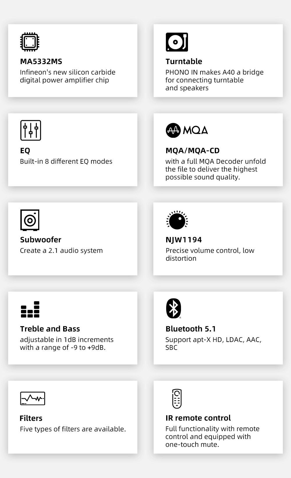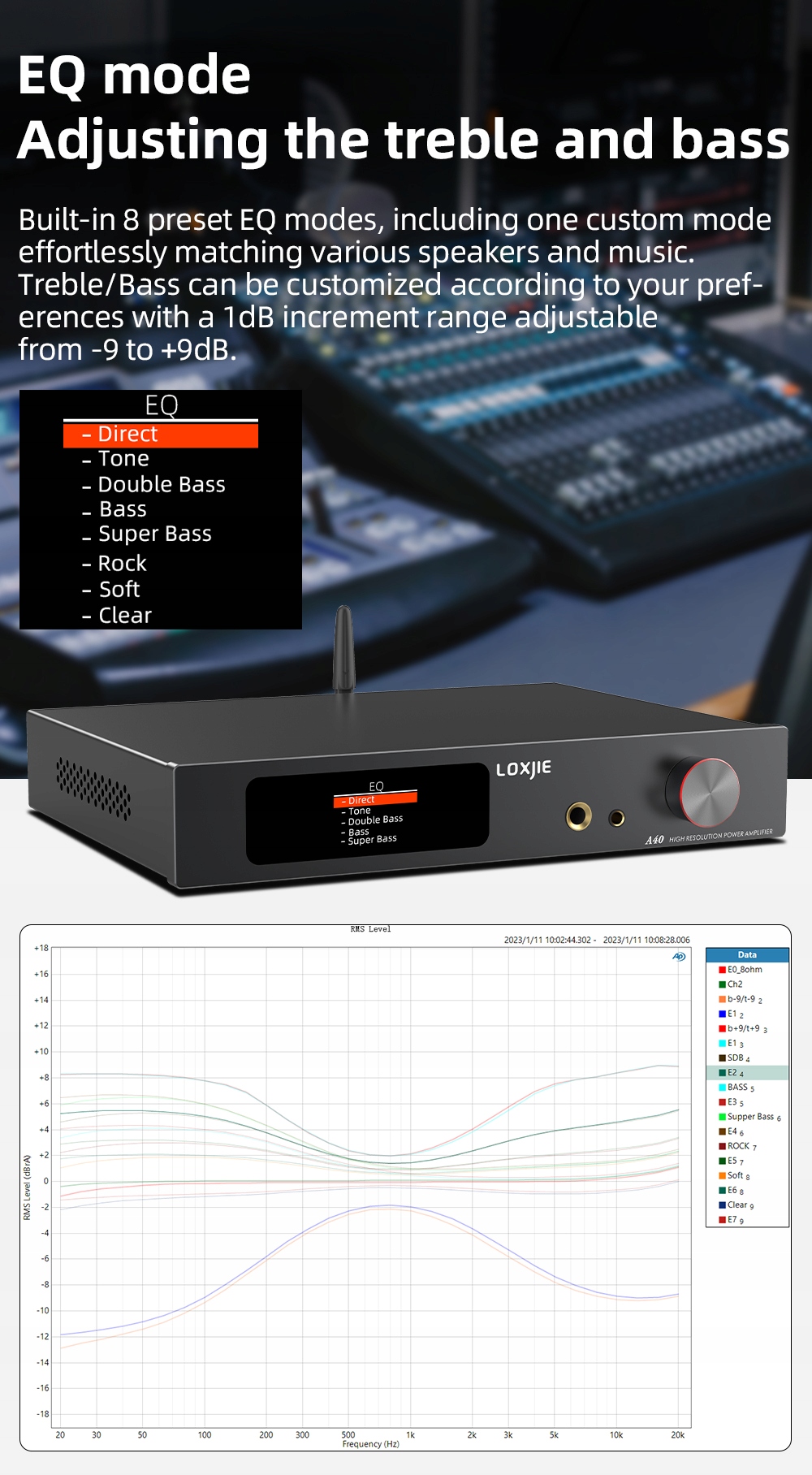 Tryb EQ dostosowuje basy i wysokie tony, z ośmioma trybami do wyboru. Do wyboru jest pięć filtrów i jest wyposażony w pilota do łatwego zdalnego sterowania A40.