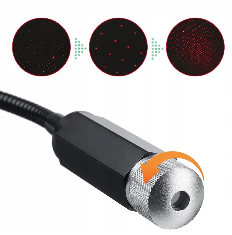 Lampka projekcyjna STARRY SKY USB to miniaturowa lampka dekoracyjna tworząca efekt rozgwieżdżonego nieba za pomocą czerwonej diody LED. Dzięki elastycznemu ramieniu możesz precyzyjnie skierować światło na sufit samochodu, ścianę lub sufit w mieszkaniu. Idealna jako lampka samochodowa LED oraz efektowna lampka dekoracyjna do domu.