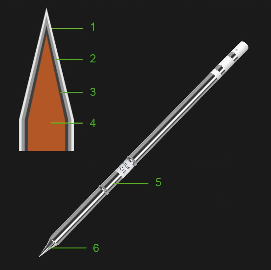 Jak widać na rysunku obok, groty z serii T-12 są zintegrowane z grzałką i czujnikiem temperatury. Tak więc element grzewczy i końcówka lutownicza to jeden element nazywany grotem. Proszę zwrócić uwagę że czujnik temperatury (termopara) jest umieszczony bardzo blisko końcówki lutowniczej grota, co zapewnia bardzo dokładny pomiar temperatury w trakcie procesu lutowania.